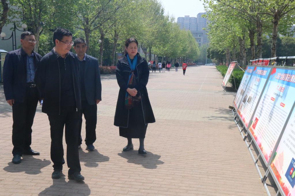 (党委书记彭占亭,党委委员、工会主席张勇,党委委员、纪委书记张明慧一行观看宣传版面)