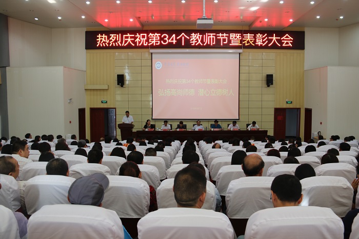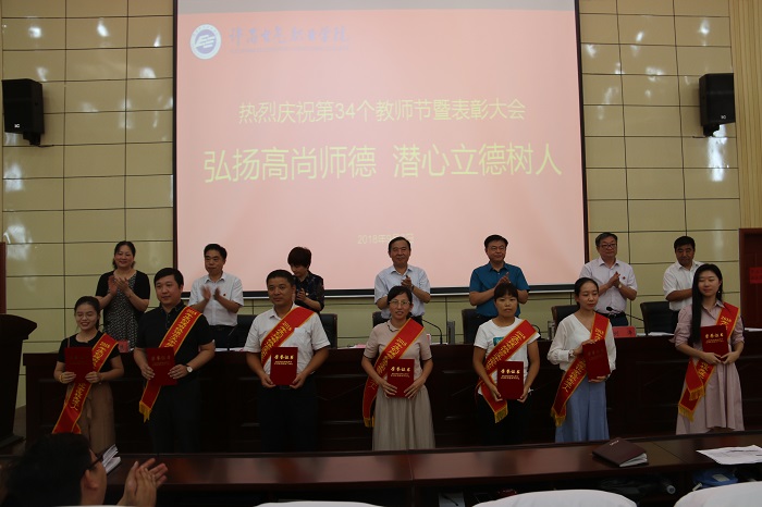 春播桃李三千圃,秋来硕果满神州。每年的九月都是学院最热闹、最有朝气的时候,每年的九月都是老师们最开心、最喜悦的时刻。伴随着满园锦翠、硕果飘香,第34个教师节悄然而至。2018年9月7日下午,我院在二期教学楼学术报告厅隆重举行教师节庆祝表彰大会。院领导杨鲁西、杨德岭、商淑敏、刘涛、冯朝印、张勇、张明慧出席大会,全院教职工参加会议,大会由副院长商淑敏主持。