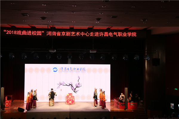 ????10月25日下午至晚间, 2018年高雅艺术进校园——河南省京剧艺术中心走进许昌电气职业学院专场演出活动在我院大礼堂举行。院组织宣传统战部、工会、团委、学生处、招生就业处、保卫处、艺术系、经管系等单位负责人和1800余名师生一同欣赏了这场高水准的艺术盛宴,感受了中国戏曲文化的非凡魅力。