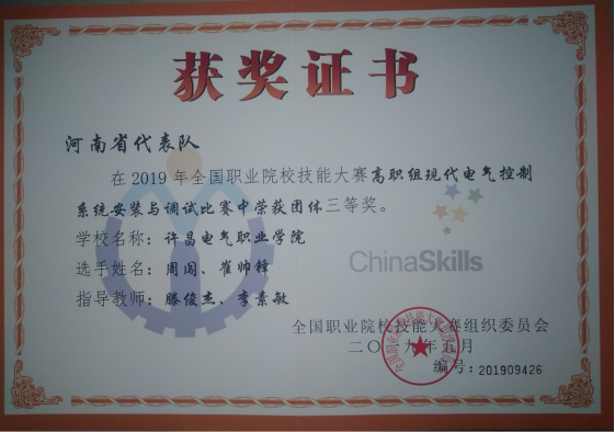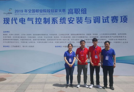 ????好成绩的取得离不开参赛师生“科学+刻苦”的训练,滕俊杰、李素敏两位指导教师认真研究比赛流程与设备特点,多次到省内外与兄弟院校师生交流学习,制定科学的训练与备赛方案,经常加班带领学生刻苦训练;周闯、崔帅锋两位参赛同学更是全身心投入到紧张的训练备赛中,师生共同研究、交换意见,刻苦练习。付出终有回报,2019年4月13日-14日,在全国高职院校职业技能大赛河南省选拔赛“现代电气控制系统安装与调试”赛项中,经过两天激烈的角逐,两位选手获得了全省一等奖的优异成绩,并且作为河南省代表队参加此次在江苏常州举办的全国职业技能大赛。