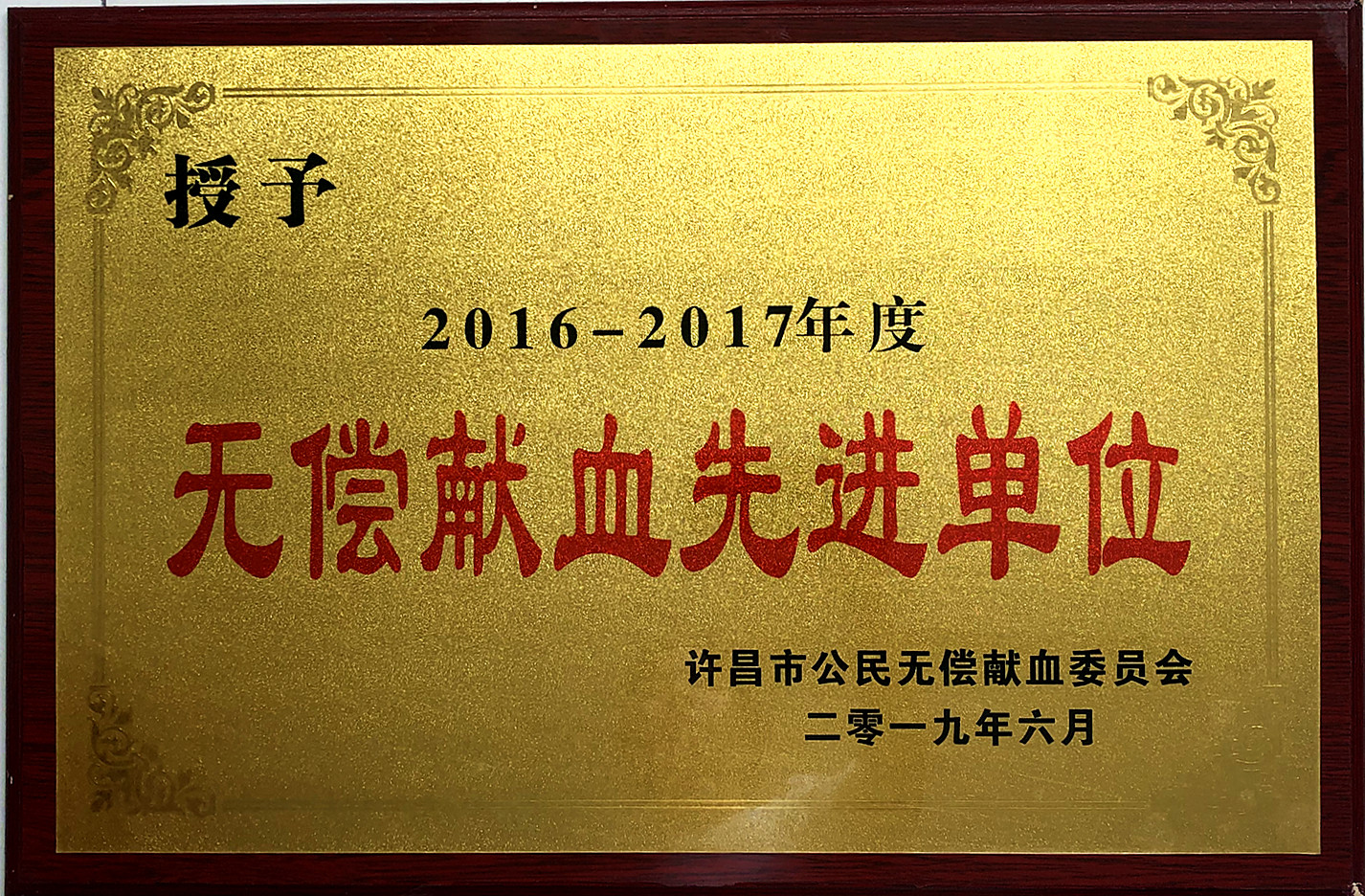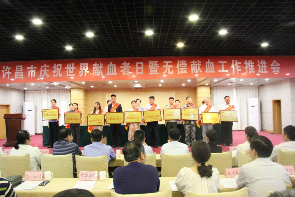 ????6月14日上午,许昌市隆重举行“庆祝世界献血者日暨无偿献血工作推进会”,无偿献血促进单位、先进单位、无偿献血先进个人代表共计300余人参加了表彰会。我院等28家单位被许昌市公民无偿献血领导组授予“许昌市无偿献血先进单位”荣誉称号。