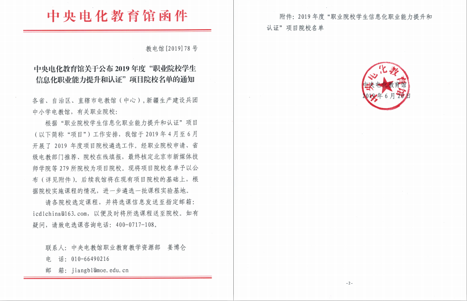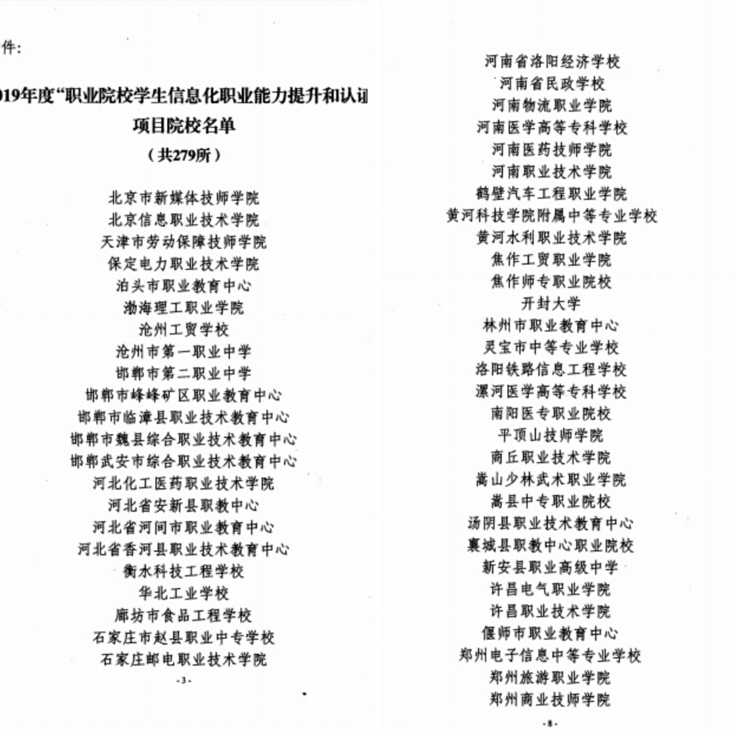 ????近日,从中央电化教育馆《关于公布2019年度“职业院校学生信息化职业能力提升和认证”项目院校名单的通知》通知中获悉,许昌电气职业学院“职业院校学生信息化职业能力提升和认证”项目获批。这标志着我院成为拥有教育部承认的ICDL培训与认证资格单位。