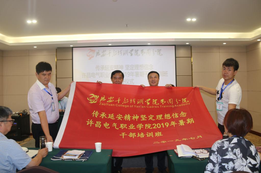 延安职业技术学院院长高福华和我院党委书记杨鲁西共同为培训班授予班旗