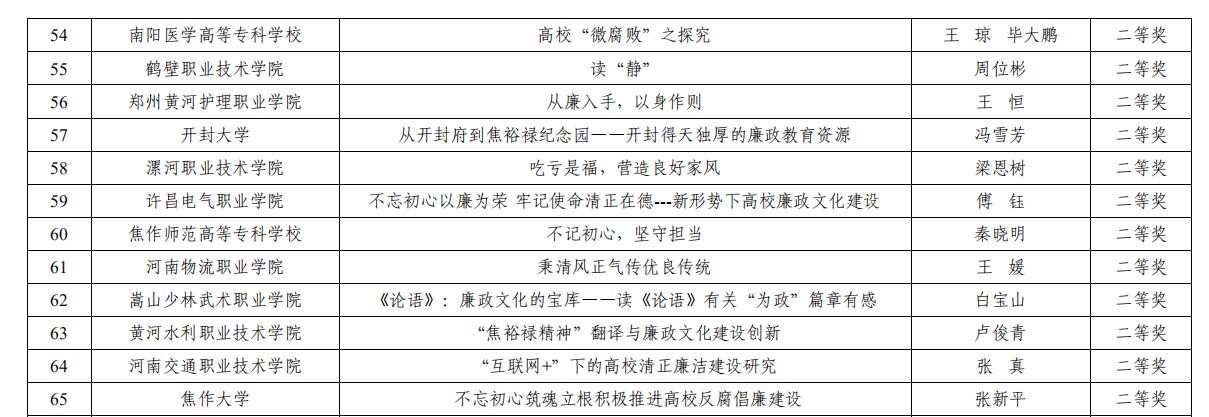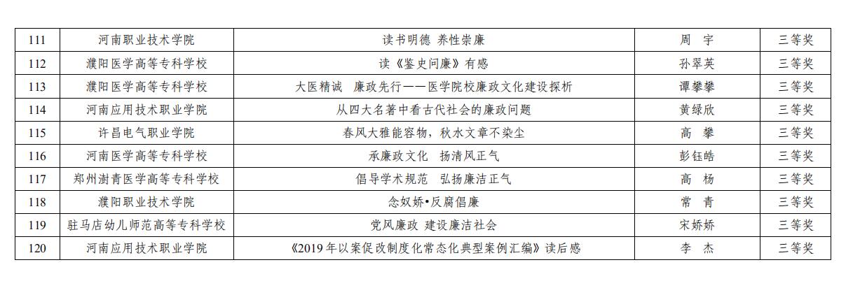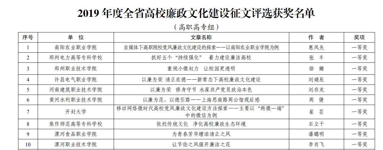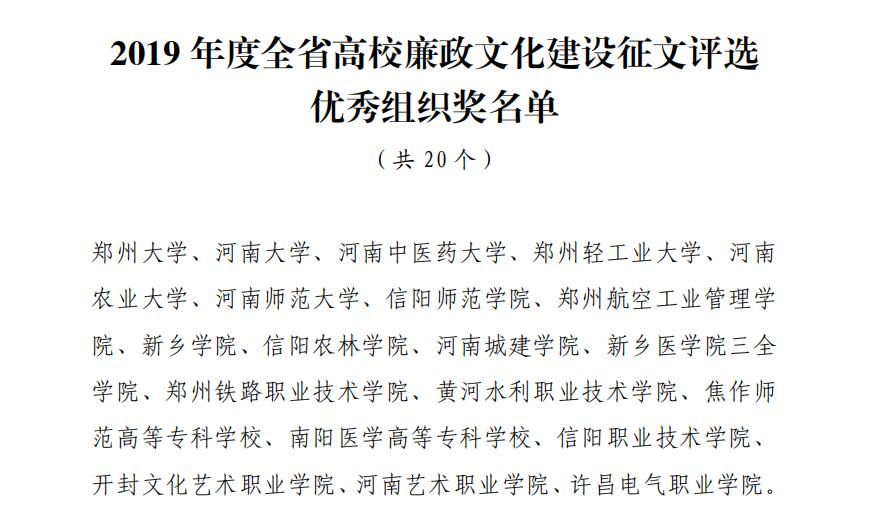????近日,中共河南省委高校工委、河南省教育厅下发了《关于公布2019年度全省高校廉政文化建设征文活动评选结果的通知》(豫高发〔2019〕65号),我院报送的作品在这次征文评选活动中分别获得一、二、三等奖,并在全省本专科院校评出20个优秀组织奖,我院为获奖单位之一。