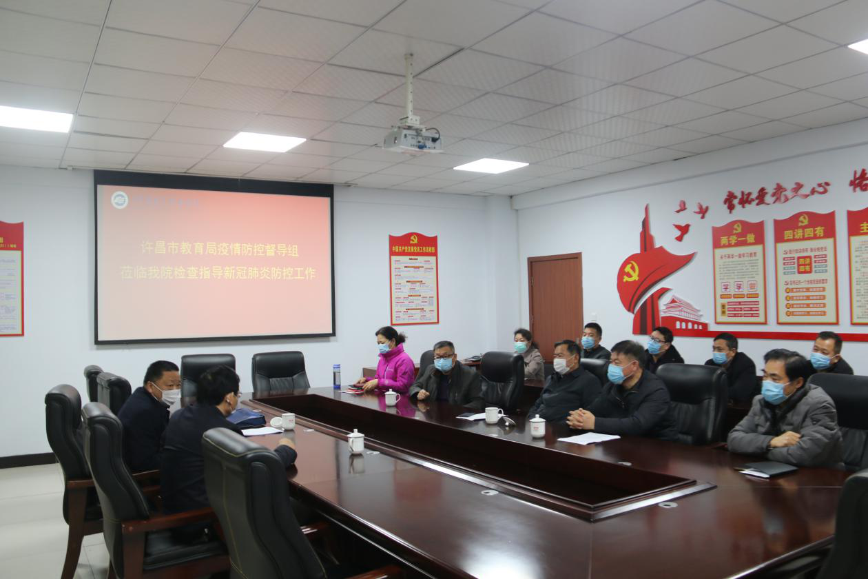 ????3月2日上午,市教育局牛振亭同志、王国防同志一行两人到我校督促检查学院疫情防控工作,参加指导学院疫情防控专题会议。我院全体班子成员,党办、院办、人事处、学生处、后勤处负责同志参加会议。