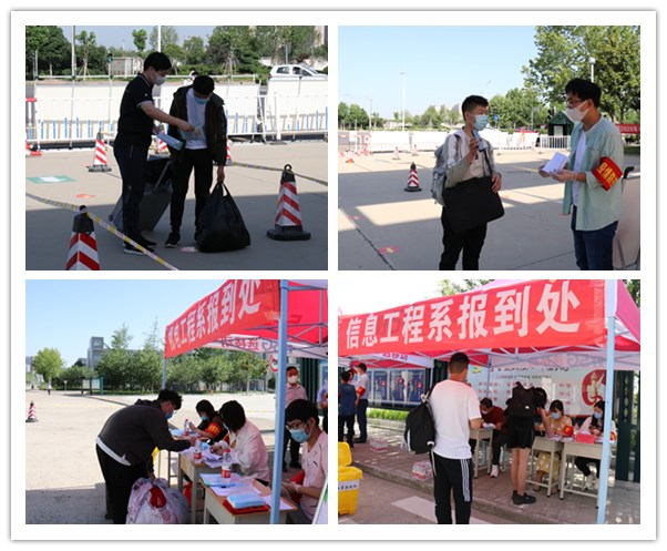 ????整个学生报到流程流畅科学。在机电工程系和信息工程系学生通道处,学生们按照间距1米以上的标准排队,向老师出示自己的健康码。各系的老师认真核实学生身份、健康码、行程记录等信息,回收学生的健康卡和健康承诺书,发放口罩和准予入校证明。学生按照指定路线返回宿舍,在宿舍门口接受第二次体温检测,行李消毒之后,方可办理入住手续。