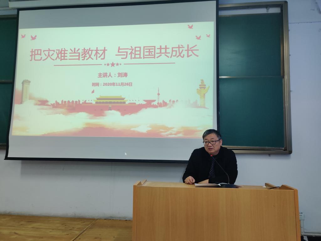 ????11月26日下午,在教学楼A211多媒体教室,学院副院长刘涛为大学生代表上了一堂以“把灾难当教材,与祖国共成长”为主题的思政课。他以战“疫”为核心进行选题,结合亲身经历,用生动的语言和深厚的内涵启迪当代大学生要把灾难当教材,再次梳理爱国教育、生命教育、信念教育、科学教育与道德教育,构建正确的世界观、人生观、价值观。