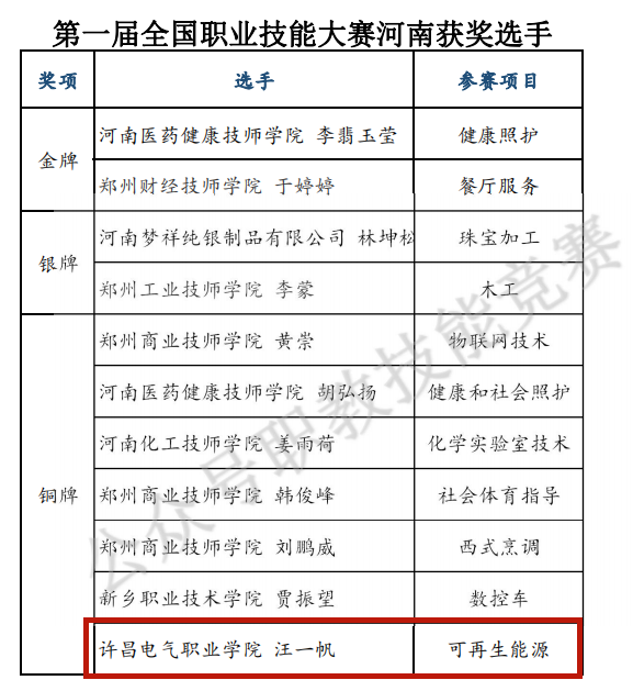 我院汪一帆同学荣获中华人民共和国第一届职业技能大赛可再生能源项目第三名!