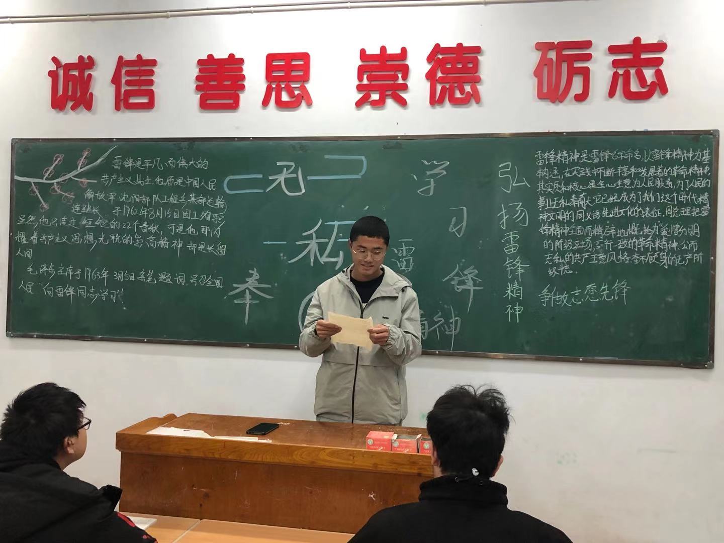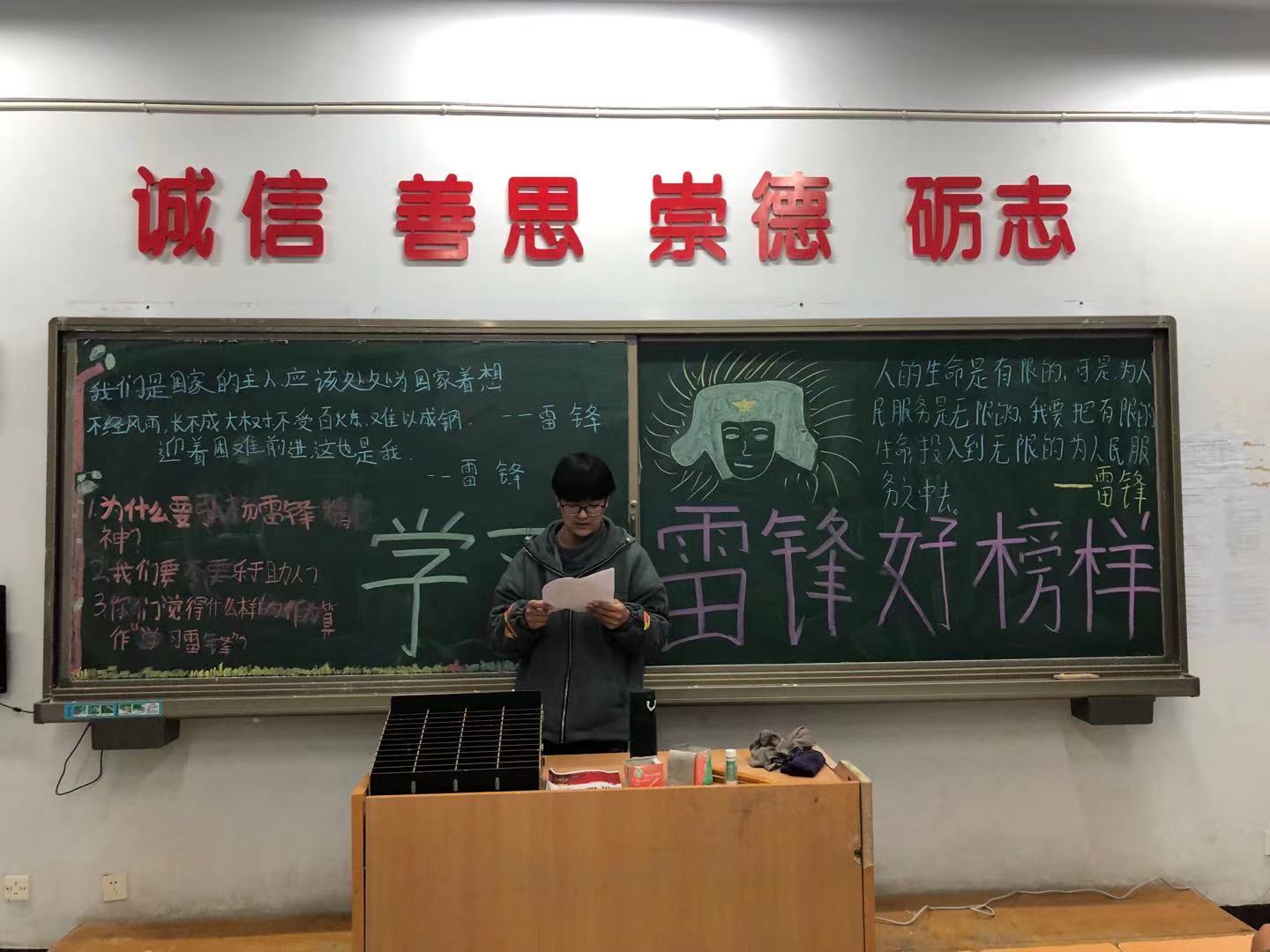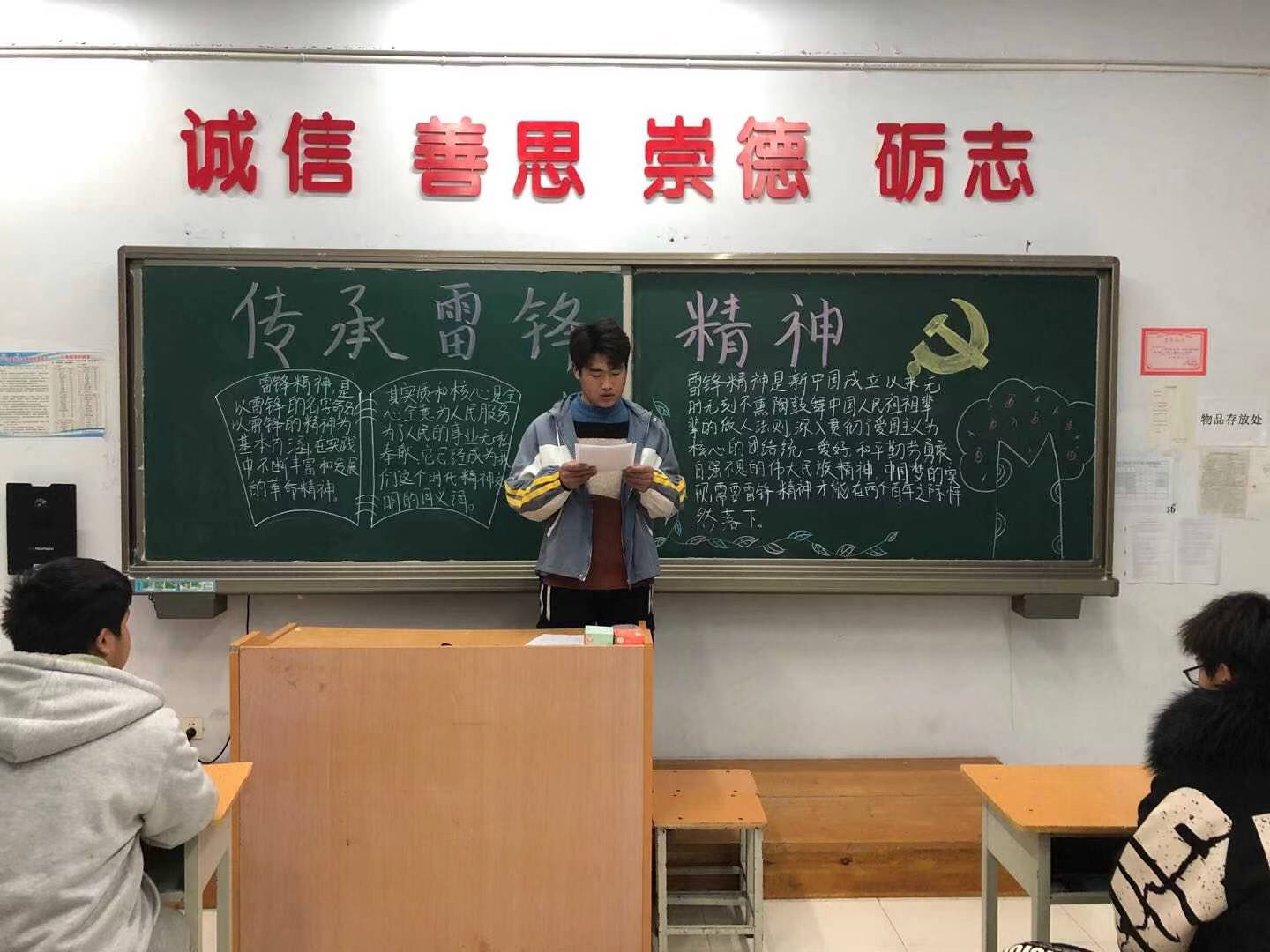 ????在团课过程中,各班级气氛活跃,活动中大家一起回顾雷锋的生命历程,体会雷锋的精神内涵,一起讨论了身边的雷锋。雷锋他以"钉子"精神,刻苦学习马列主义、毛泽东思想,坚持理论联系实际,努力实践,因而具备了全心全意为人民服务的无私忘我的奉献精神值得我们学习。虽然雷锋已经去世,但是雷锋永远活在亿万人民心中!他度过了只有短短的22个春秋,可是他那闪耀着共产主义思想光辉的崇高精神却长留人间。他的爱憎分明、言行一致、公而忘私、奋不顾身、艰苦奋斗、助人为乐,把有限的生命投入到无限的为人民服务之中去的崇高精神,集中体现了中华民族的传统美德和共产主义道德品质,另人敬佩。