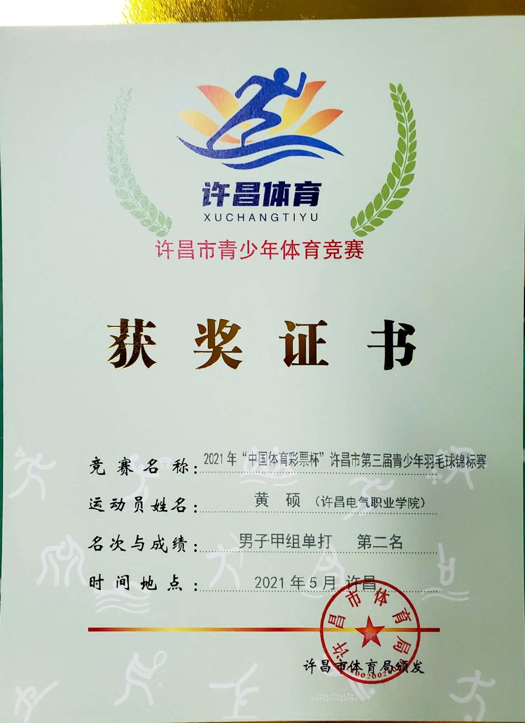 5月22日上午,许昌市第三届青少年羽毛球锦标赛在许昌市体育运动学校举办。我院代表队由体育教研组长宋冠宇担任领队,体育组教师张世浩担任教练员。比赛中,我校学生展现出顽强拼搏、勇争第一的优良精神面貌,赛出了水平,赛出了意志,赛出了风采。通过两天的激烈比拼,我院电气工程系队员黄硕最终获得男子甲组单打第二名的好成绩。