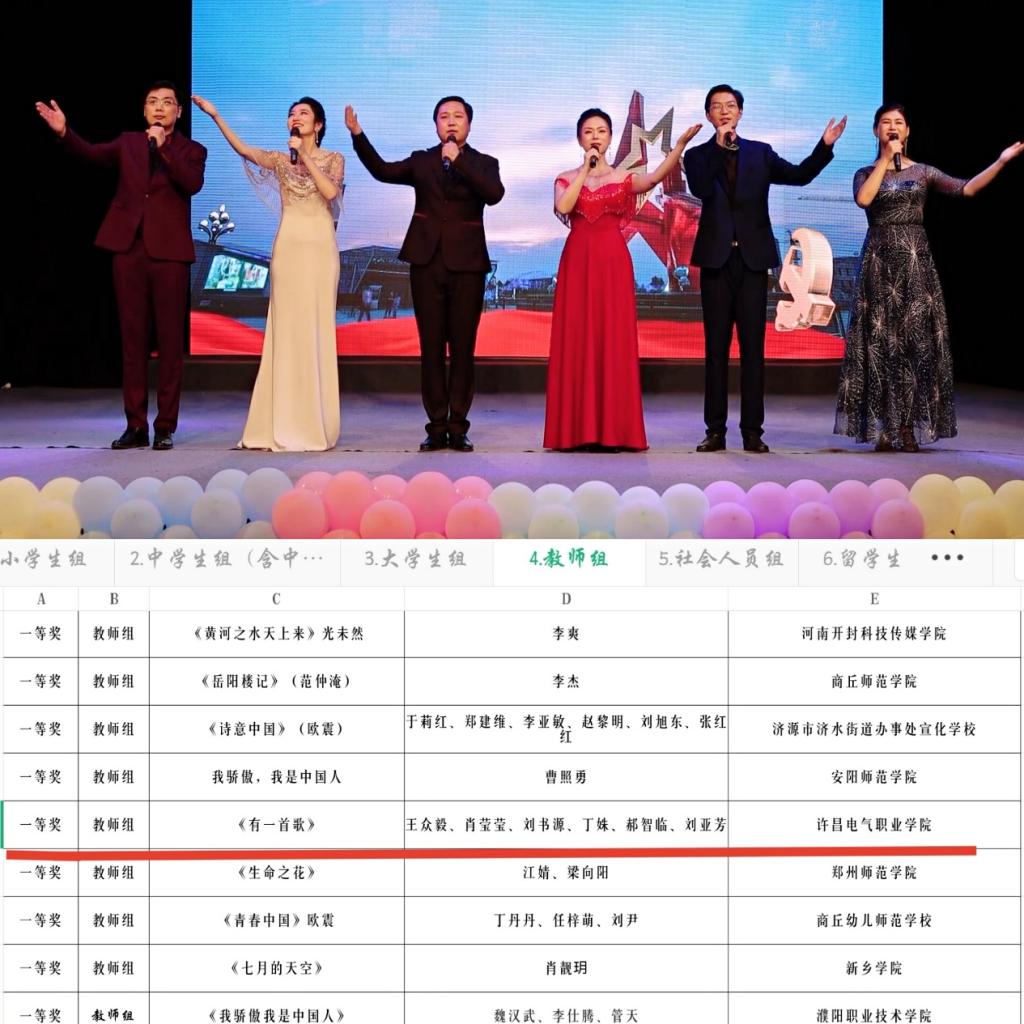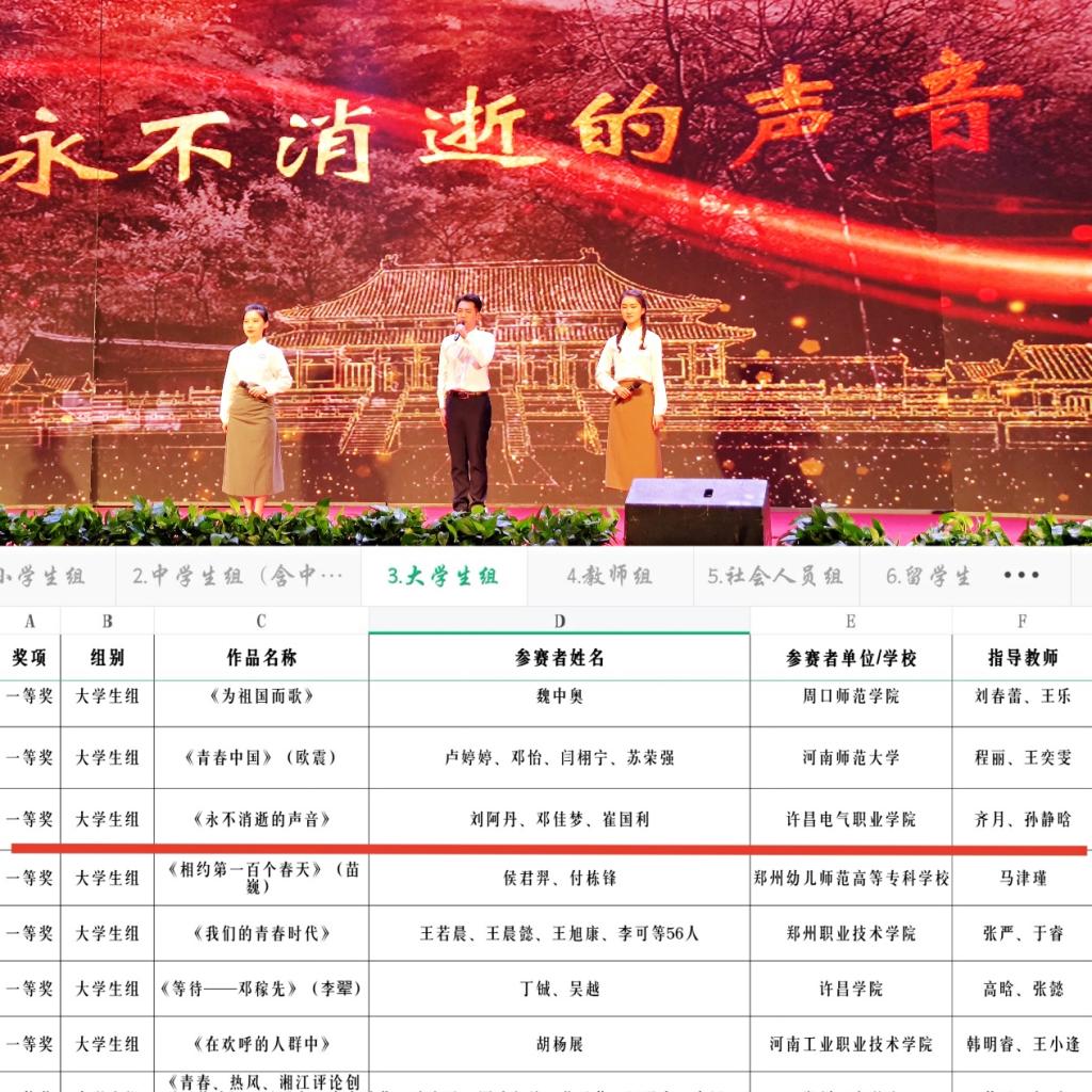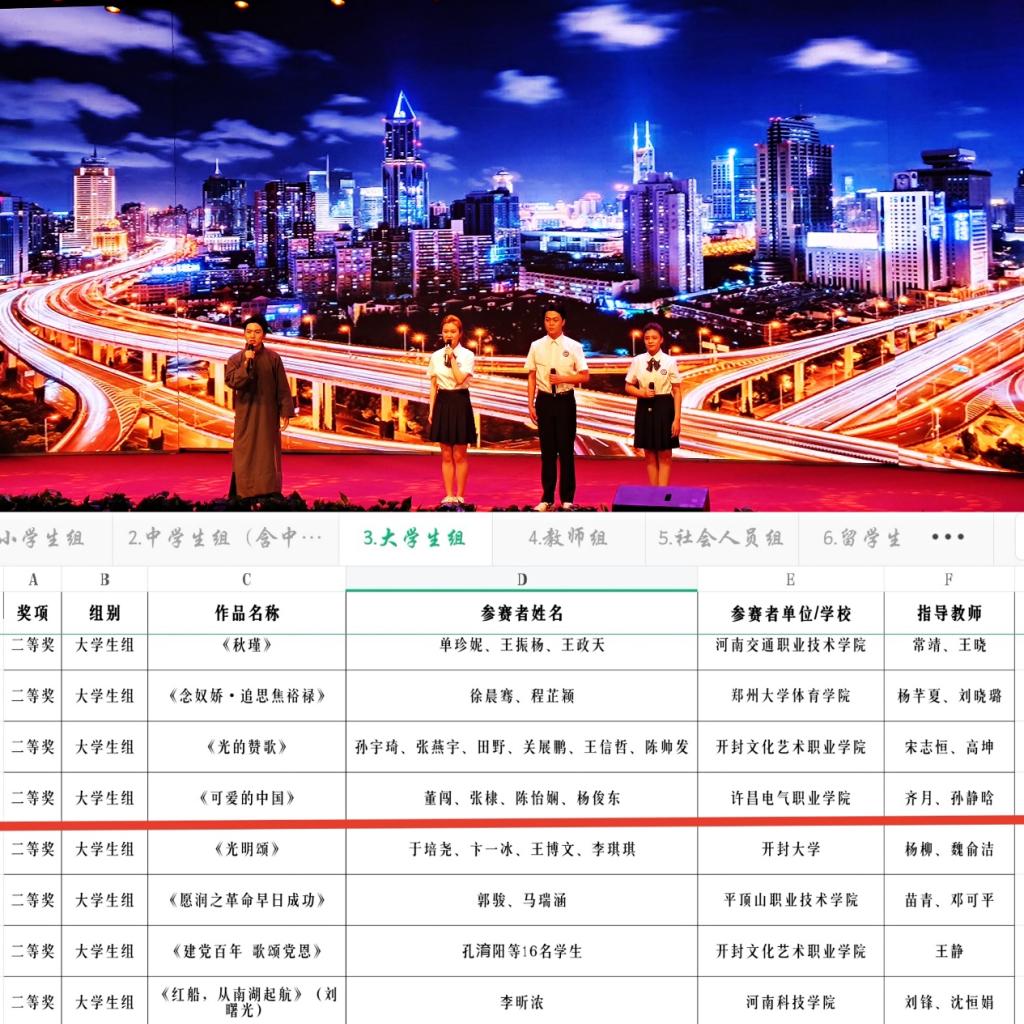 近日,根据河南省教育厅《关于公布2021年中华经典诵写讲大赛评选结果的通知》(教社语〔2021〕303号)获悉,我院选送的四部作品均获佳绩,我院获优秀组织单位奖。王众毅等诵读作品《有一首歌》获教师组一等奖、卢营等诵读作品《信念永恒》获教师组二等奖;刘阿丹等诵读作品《永不消逝的声音》获大学生组一等奖,齐月、孙静晗获“最佳辅导教师”荣誉称号,董闯等诵读作品《可爱的中国》获大学生组二等奖。
