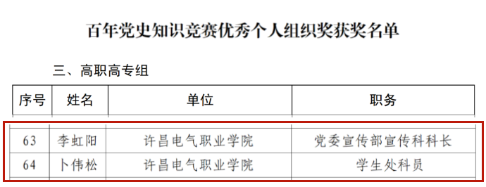 近日,由省委高校工委、省教育厅、河南广播电视台主办的“100年党史100问”——“永远跟党走 奋斗新征程”庆祝建党100周年活动百年党史知识竞赛公布获奖结果,我院荣获高职高专组二等奖和优秀个人组织奖两项荣誉。