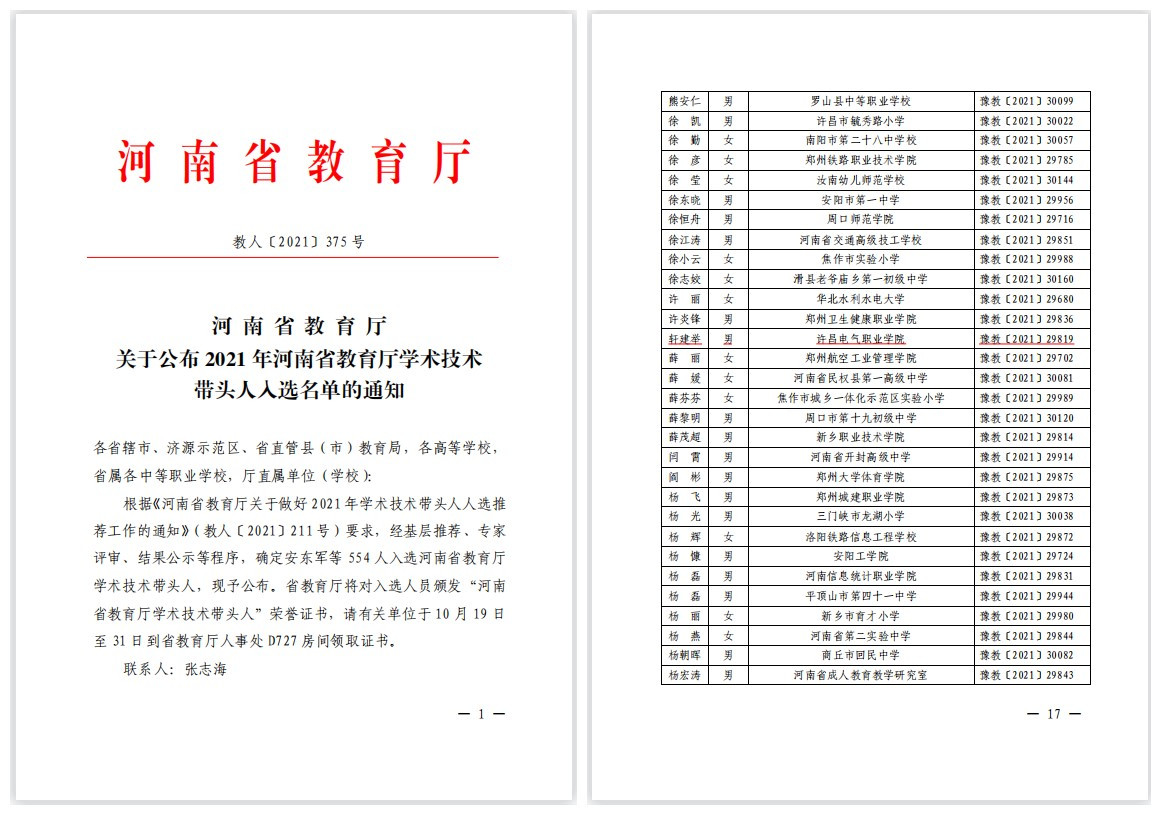 近日,河南省教育厅发布关于2021年河南省教育厅学术技术带头人入选名单的公示,经基层推荐、专家评审,确定554人入选河南省教育厅学术技术带头人,我院教师轩建举入选。