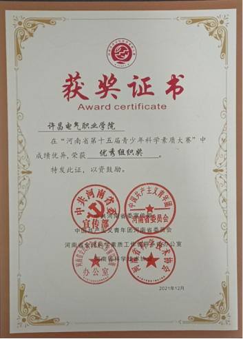 近日,我院喜获中共河南省委宣传部、中国共产主义青年团河南省委员会、河南省全民科学素质工作领导小组办公室、河南省科学技术协会联合授予的"河南省第十五届青少年科学素质大赛"优秀组织奖和中共许昌市委宣传部、中国共产主义青年团许昌市委员会、许昌市全民科学素质工作领导小组办公室、许昌市科学技术协会联合授予的"河南省第十五届青少年科学素质大赛"组织奖。