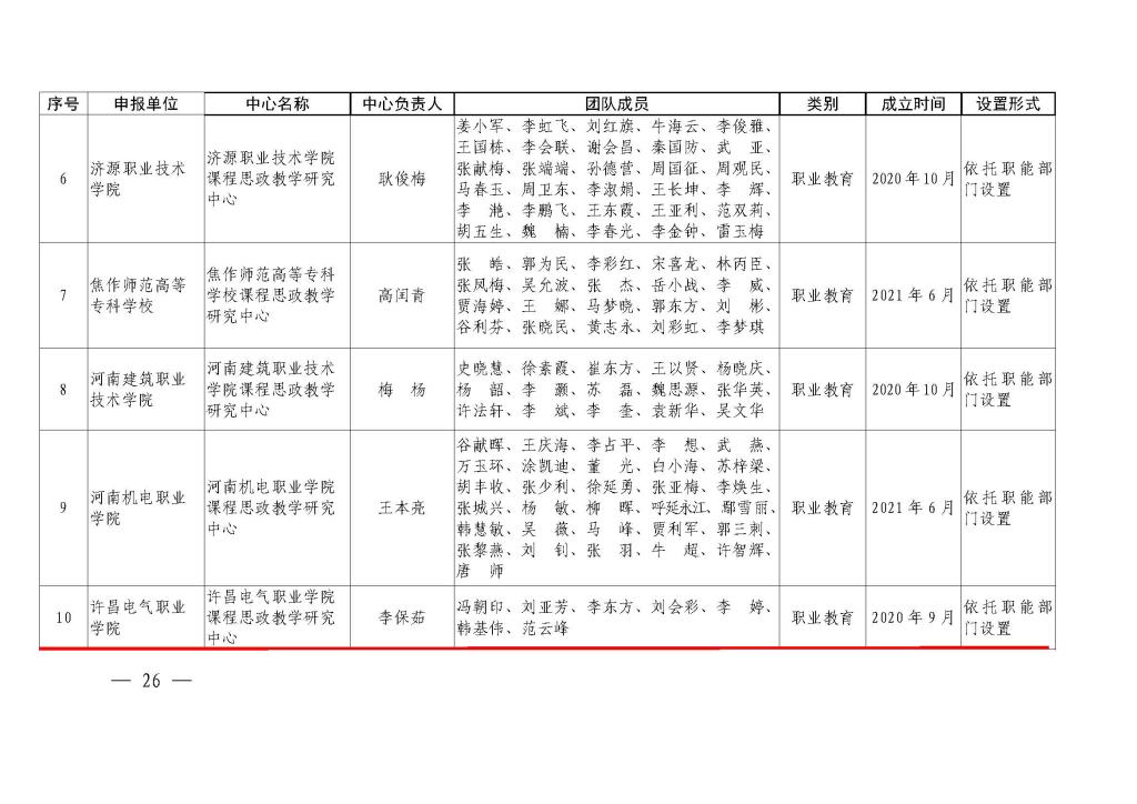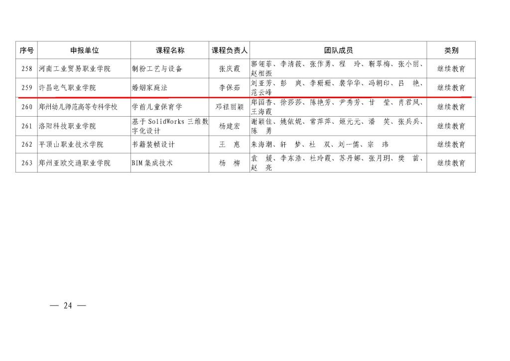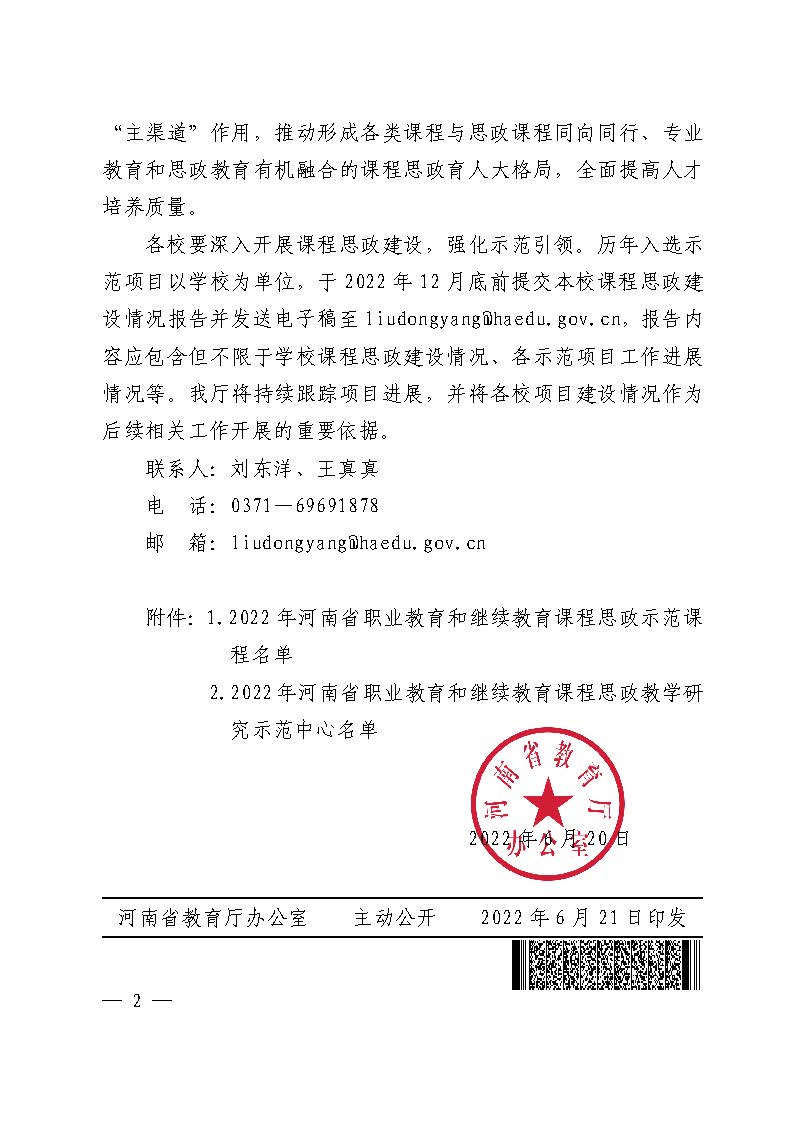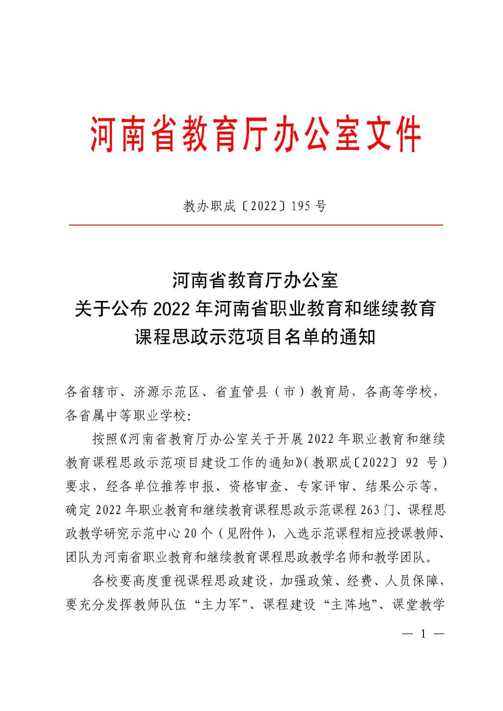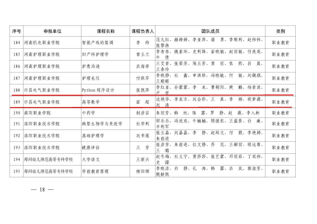 近日,河南省教育厅下发了《关于公布2022年河南省职业教育和继续教育课程思政示范项目名单的通知》(教职成[2022]195号),认定我院课程思政教学研究中心为省级课程思政教学研究示范中心,认定《Python程序设计》、《高等数学》、《婚姻家庭法》三门课程为省级职业教育和继续教育课程思政示范课程,入选示范课程相应授课教师、团队为河南省职业教育和继续教育课程思政教学名师和教学团队。