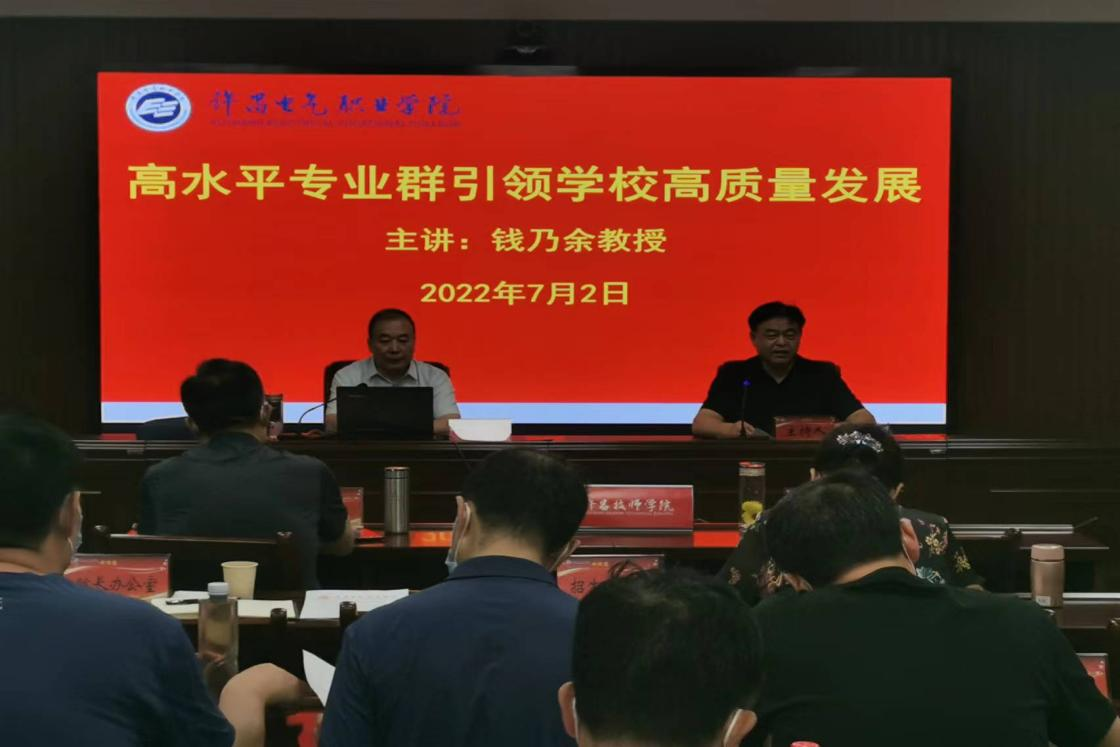 钱乃余教授围绕“高水平专业群课程建设和师资培养,助力学校的专业升本、升级为国家级高水平专业群和培育国家级标志性成果”为中心,从助力学校高水平专业群高质量发展、学校高水平专业群建设情况和专业升本规划、高水平专业群和升本专业课程内容重构和教学模式改革等方面为与会大家进行了探讨和深入交流。会上教务处长及各系部主任与钱教授进行了现场提问和交流。