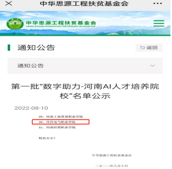 近日,中华思源工程扶贫基金会发布第一批“数字助力—河南AI人才培养”(高校AI人才培养)名单公示,由我院信息工程系申报的“数字助力-河南AI人才培养院校”成功获批。