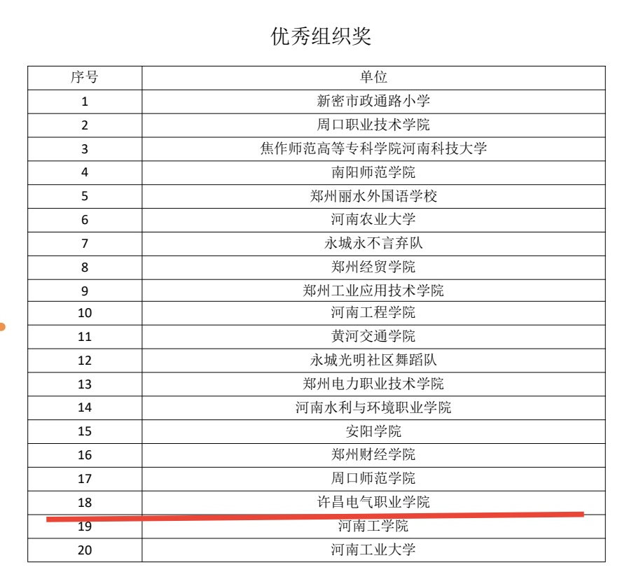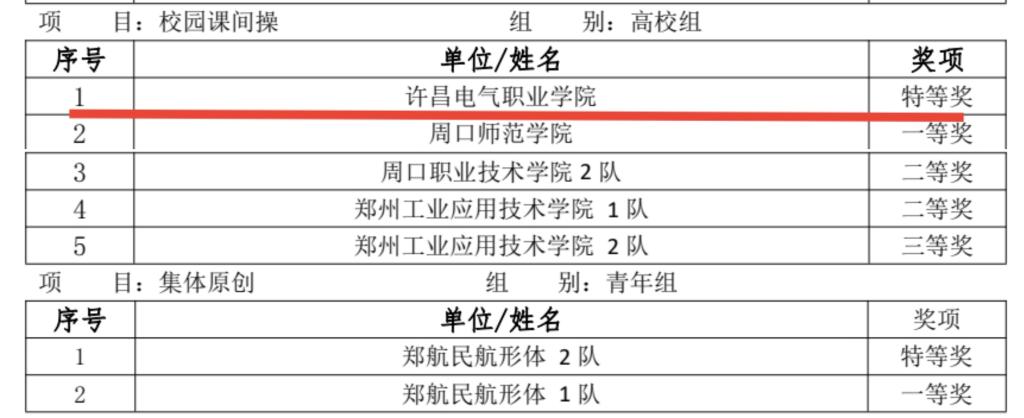 2022年12月17日-18日,在2022年“全民健身舞起来、我的时代正精彩”全国排舞社区运动会校园部(河南站)网络大赛中,我院由42名学生组成的代表队获得高校组校园课间操项目特等奖,我院获“优秀组织奖”荣誉称号,高嘉晨、张世浩获“优秀教练员”荣誉称号。