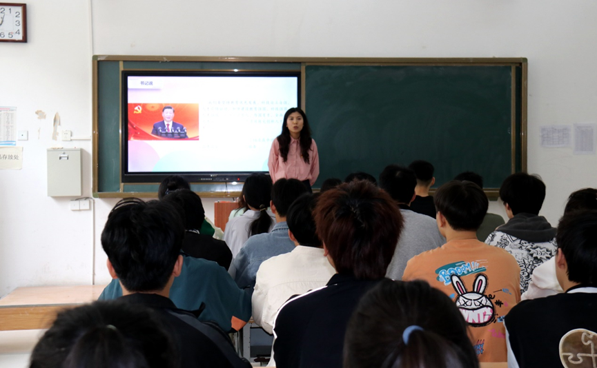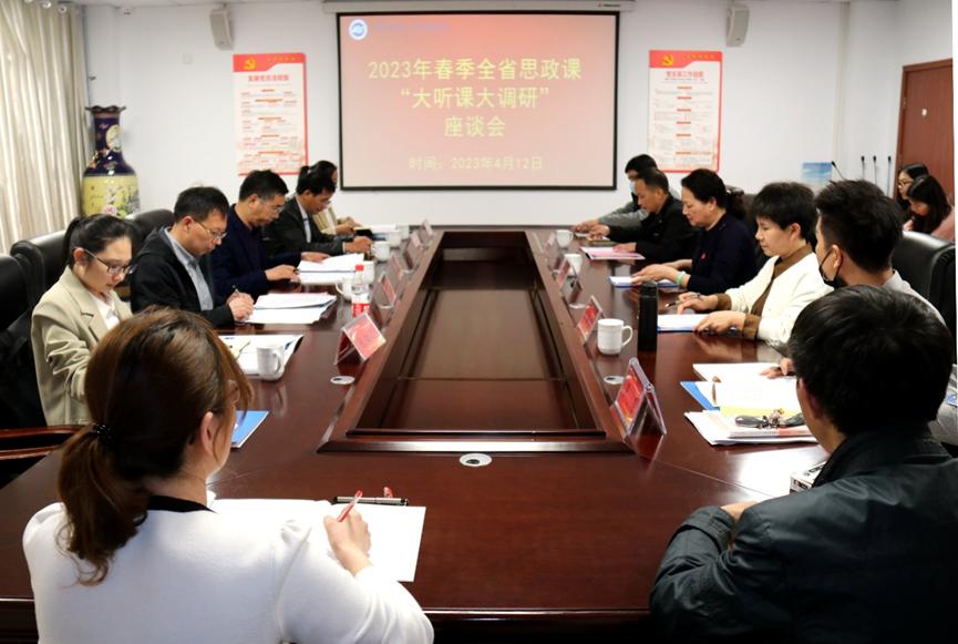 为深入学习贯彻党的二十大精神和习近平总书记关于思政课建设的重要论述,扎实推进高校思政课教育教学质量提升行动,按照省教工委、省教育厅安排,4月12日下午,省教育厅春季学期思政课“大听课 大调研”第十二组调研组、信阳师范学院马克思主义学院院长唐国战一行6人莅临我院,调研思政课建设情况并召开座谈会。会议由院党委副书记张明慧主持,思政部主任李保茹、副主任宋贵斌,思政教研室主任卢营及部分思政教师、学生代表参加座谈。