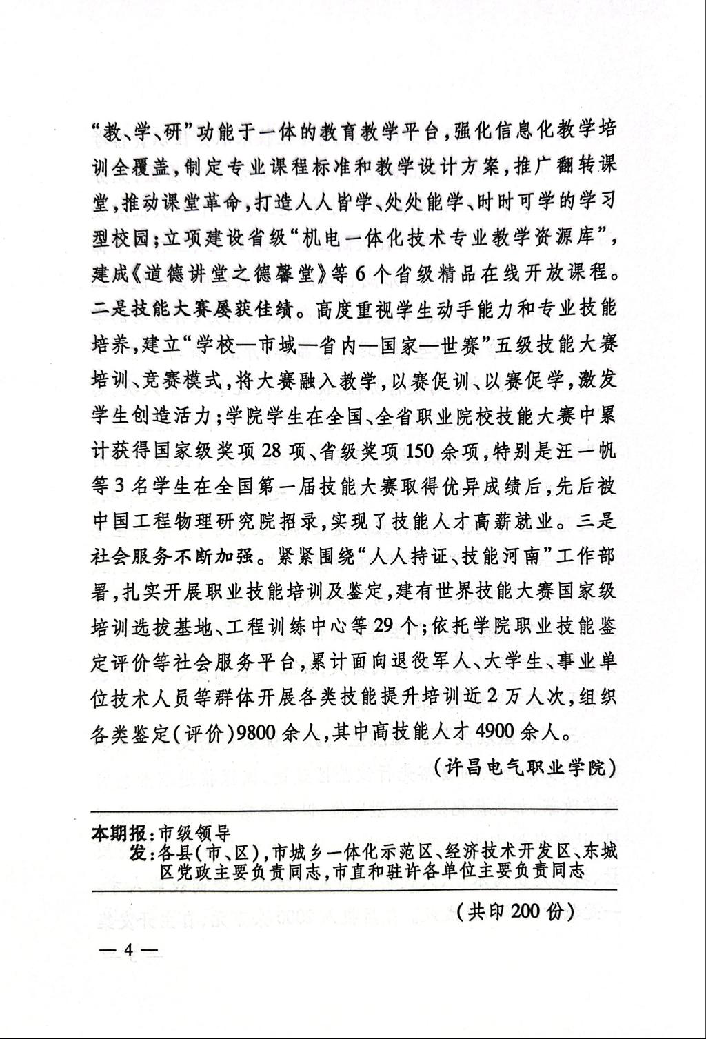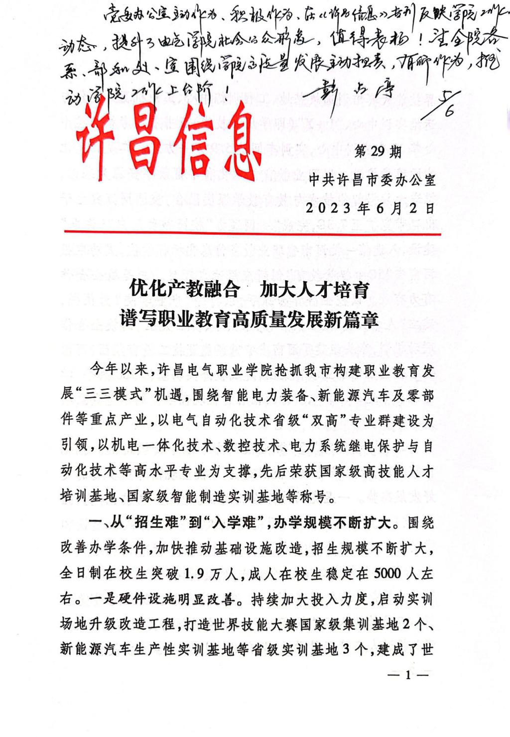 6月2日,许昌市委办公室主办的《许昌信息》专刊发了我院题为《优化产教融合,加大人才培育,谱写职业教育高质量发展新篇章》工作信息,对我校近年工作予以高度肯定。
