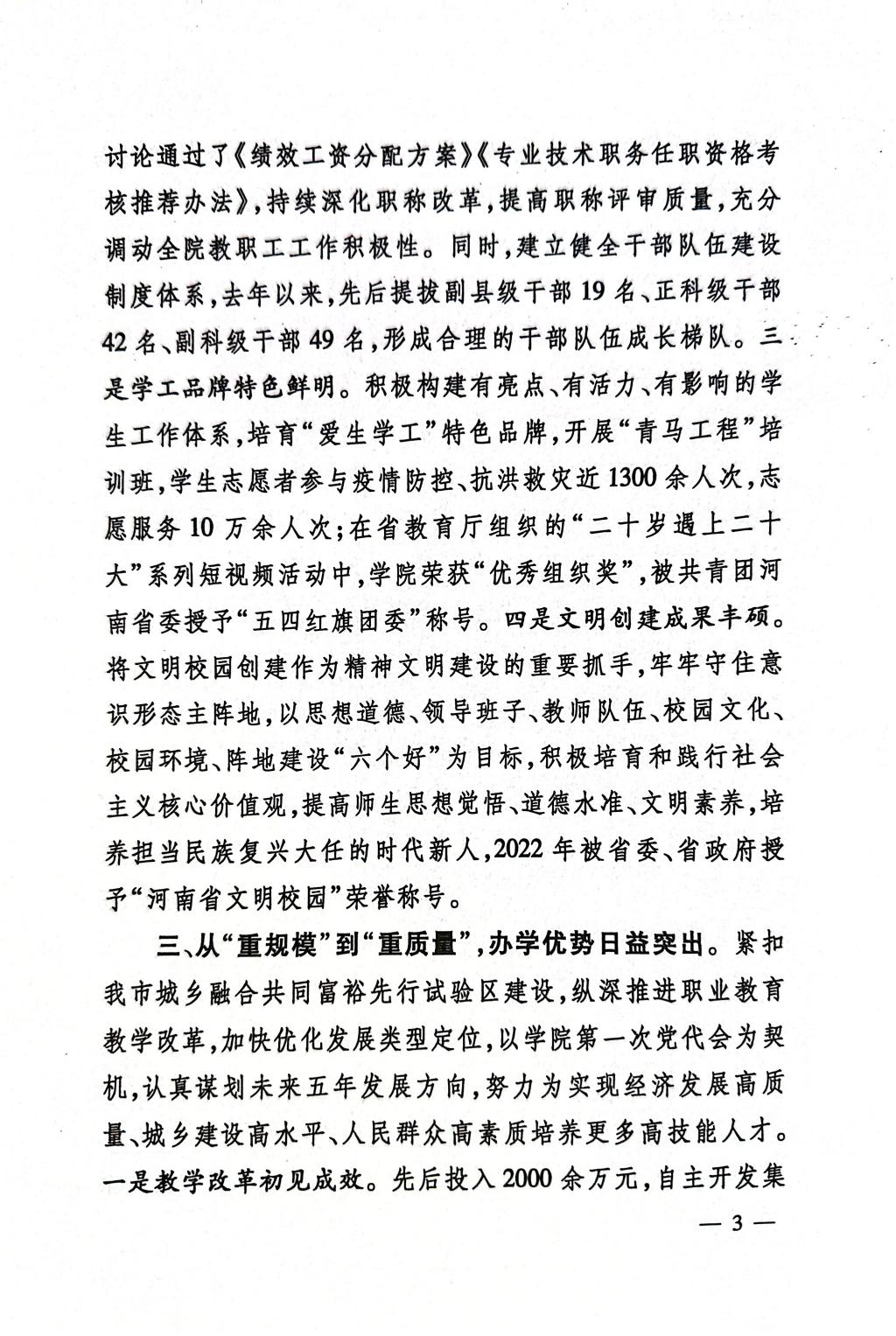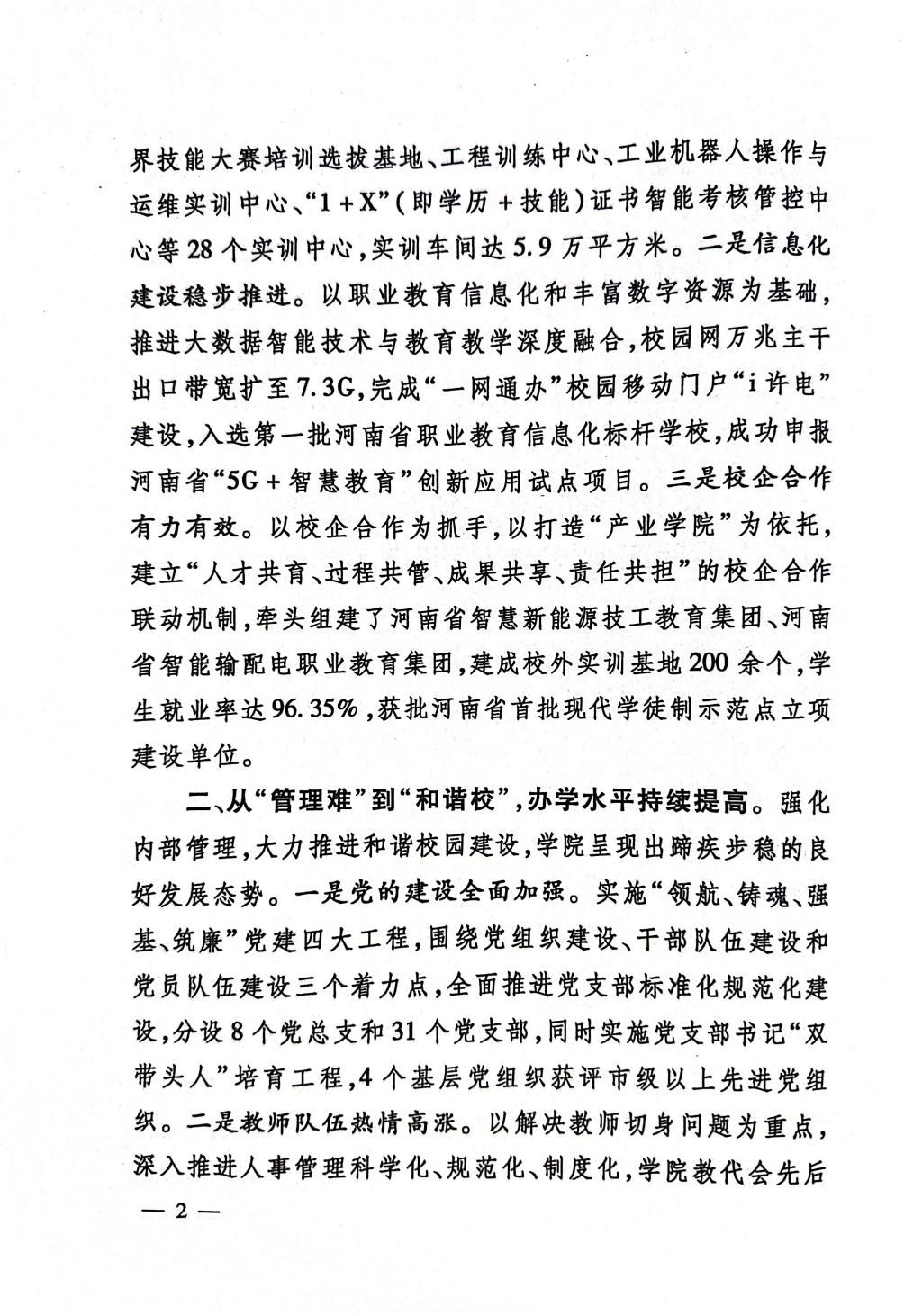 近年来,学院强化内部管理,大力推进和谐校园建设,呈现出蹄疾步稳的良好发展态势。一是党的建设全面加强。学院围绕党组织建设、干部队伍建设和党员队伍建设三个着力点,推进党支部标准化建设,分设8个党总支和31个党支部,同时实施党支部书记“双带头人”培育工程,4个基层党组织获评市级以上先进党组织;立足打造高素质干部队伍,建立健全干部队伍建设制度体系,去年以来先后提拔副县级干部19名、正科级干部42名、副科级干部49名,形成合理的干部队伍成长梯队。二是教师队伍热情高涨。学院以解决教师切身问题为重点,深入推进人事管理科学化、规范化、制度化,学院教代会先后讨论通过了《绩效工资分配方案》《专业技术职务任职资格考核推荐办法》,持续深化职称改革,提高职称评审质量,充分调动全院教职工工作积极性。三是学工品牌特色鲜明。学院积极构建有亮点、有活力、有影响的学生工作体系,培育“爱生学工”特色品牌,开展“青马工程”培训班,学生志愿者参与疫情防控、抗洪救灾近1300余人次,志愿服务10万余人次;在省教育厅组织的“二十岁遇上二十大”系列短视频活动中,学院荣获“优秀组织奖”,被共青团河南省委授予“五四红旗团委”称号。四是文明创建成果丰硕。学院将文明校园创建作为精神文明建设的重要抓手,牢牢守住意识形态主阵地,以思想道德、领导班子、教师队伍、校园文化、校园环境、阵地建设“六个好”为目标,积极培育和践行社会主义核心价值观,提高师生思想觉悟、道德水准、文明素养,培养担当民族复兴大任的时代新人,2022年被省委、省政府授予“河南省文明校园”荣誉称号。