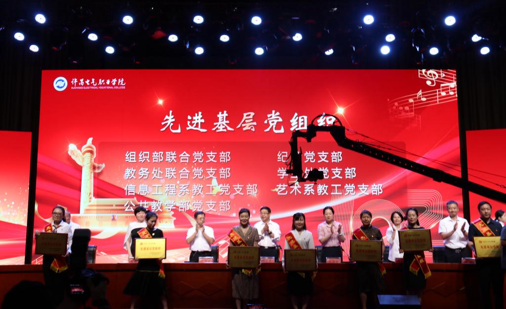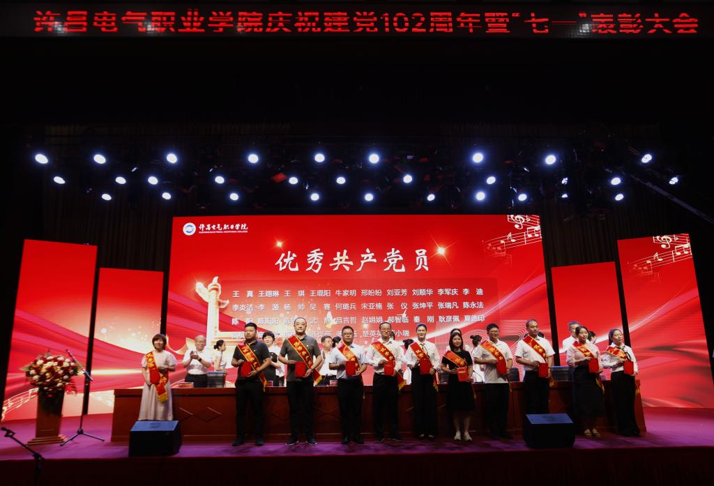 大会在庄严的国歌声中拉开序幕,首先,党委委员、工会主席张贵军宣读《中共许昌电气职业学院委员会关于表彰2023年先进基层党组织、优秀党务工作者和优秀共产党员的决定》,对组织部联合党支部等7个先进基层党组织,卜伟松等15名优秀党务工作者,王真等37名优秀共产党员进行表彰。党委委员依次为先进集体和优秀个人颁发荣誉奖牌和荣誉证书。接着,举行新党员入党宣誓仪式及全体党员同志重温入党誓词仪式。学院党委书记彭占亭领誓,与会全体党员起立,面向党旗,高举右拳庄严宣誓,重忆入党初心,表达对党绝对忠诚和为事业奋斗终身的决心。