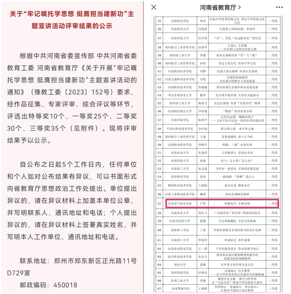 近日,由中共河南省委宣传部、中共河南省委教育工委、 河南省教育厅主办的“牢记嘱托学思想 挺膺担当建新功”主题宣讲活动对评选结果进行了公示,经作品征集、专家评审、综合评议等环节,我院思政部卢营老师宣讲的《焦桐花开 丰碑永铸》荣获二等奖。