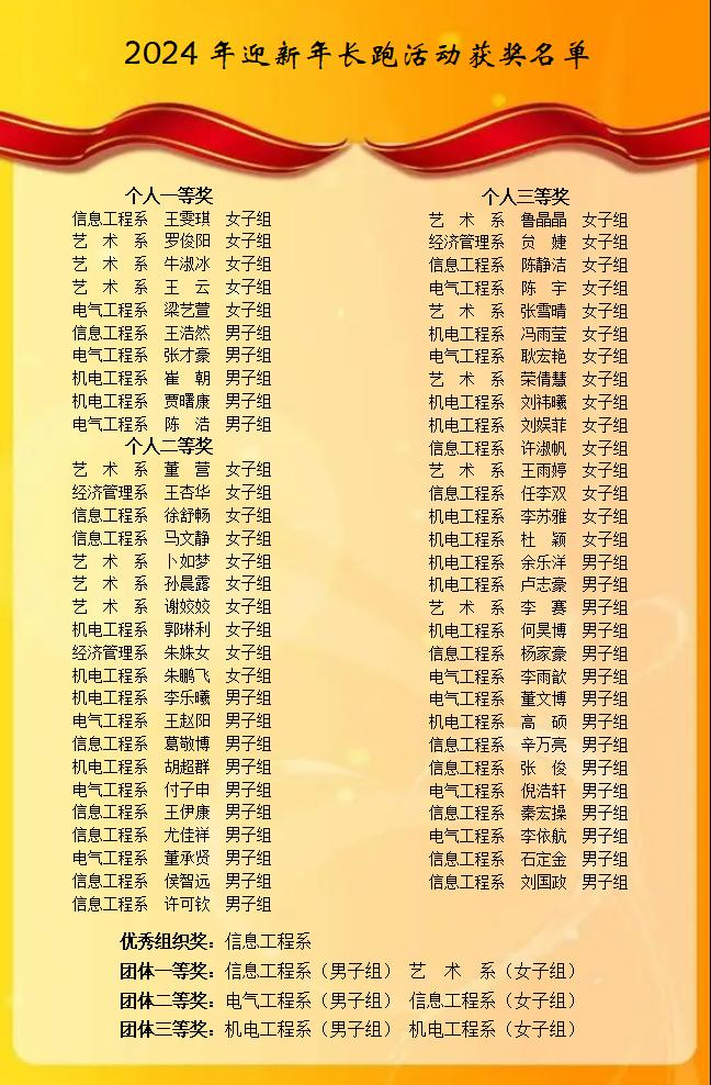 东风吹拂,战鼓隆隆,我们踏着坚定的步伐,迎接新年的曙光。为了提高学生的身体素质,磨炼其意志品质,我院于12月28日举办了2024年迎新年长跑活动。并在赛后举行颁奖仪式,院长高远浩、党委副书记张明慧、工会主席张贵军、纪委书记张晓华、副院长朱东煜,以及党委宣传部、学生处、保卫处、院团委和各系部的领导出席仪式。