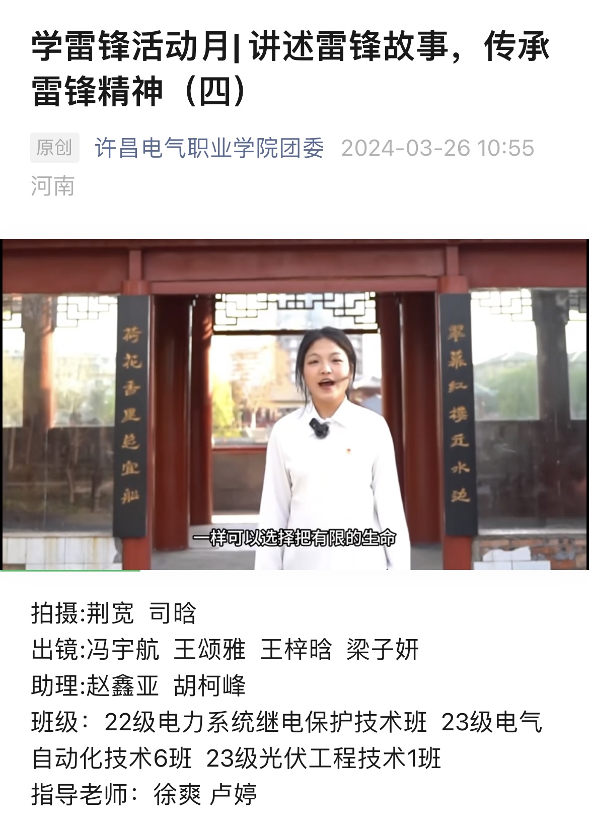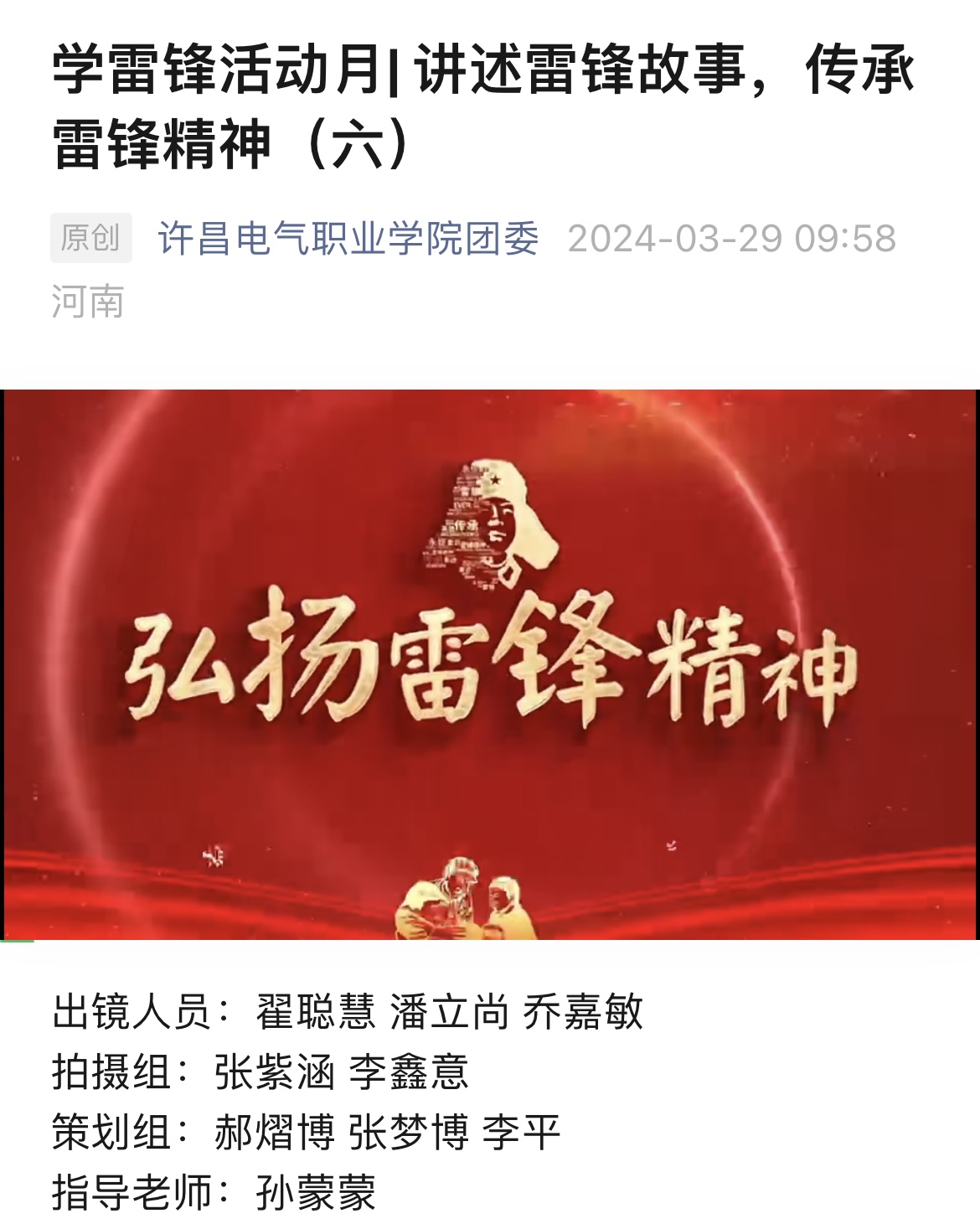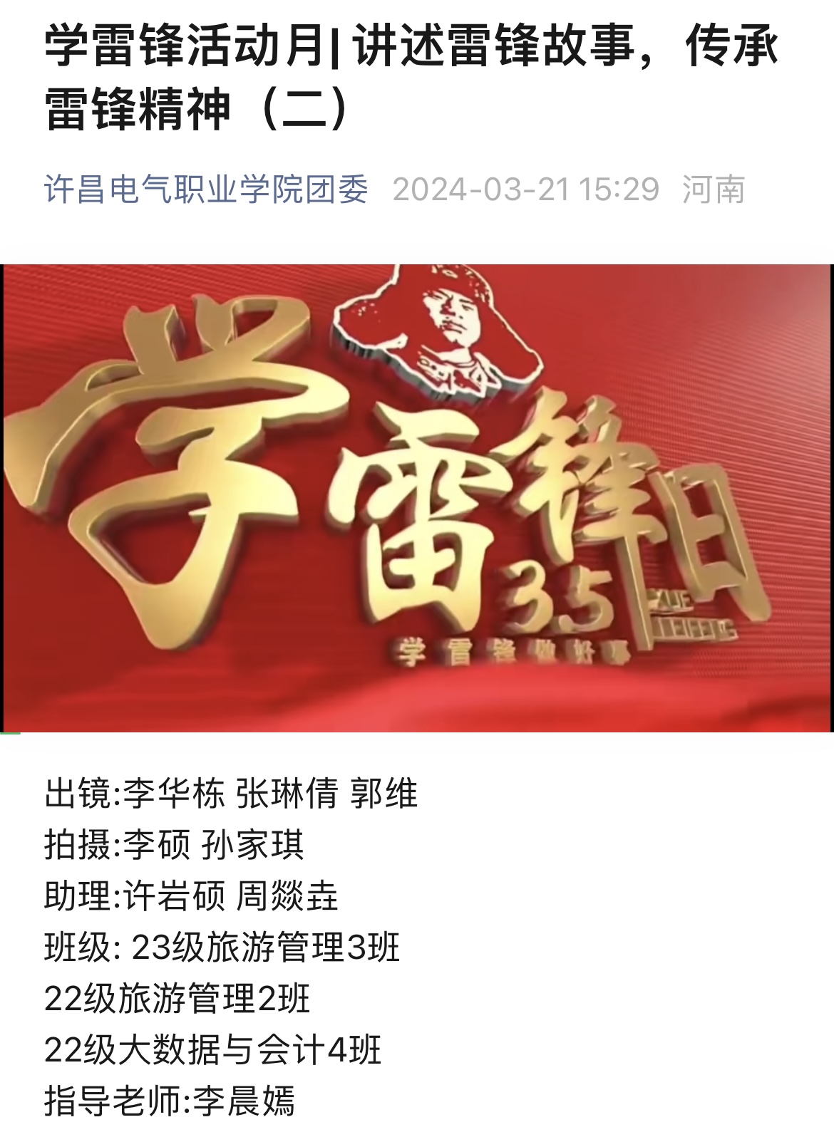 三月微雨滋润,雷锋精神永传。许电学子积极响应号召,从小事做起,从点滴做起,努力将雷锋精神传递到每个角落,让学雷锋活动融入日常、化作经常,让雷锋精神在新时代绽放更加璀璨的光芒。