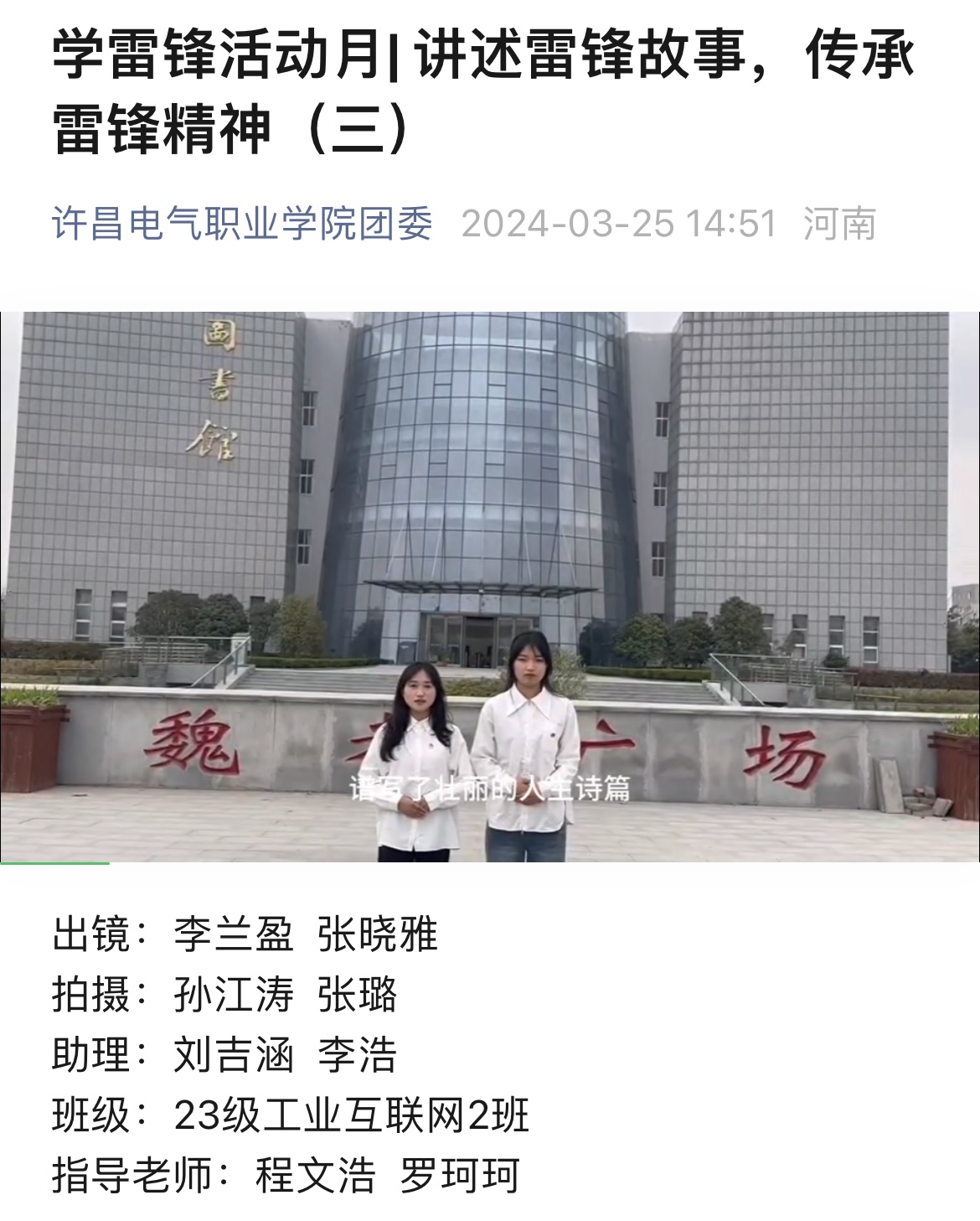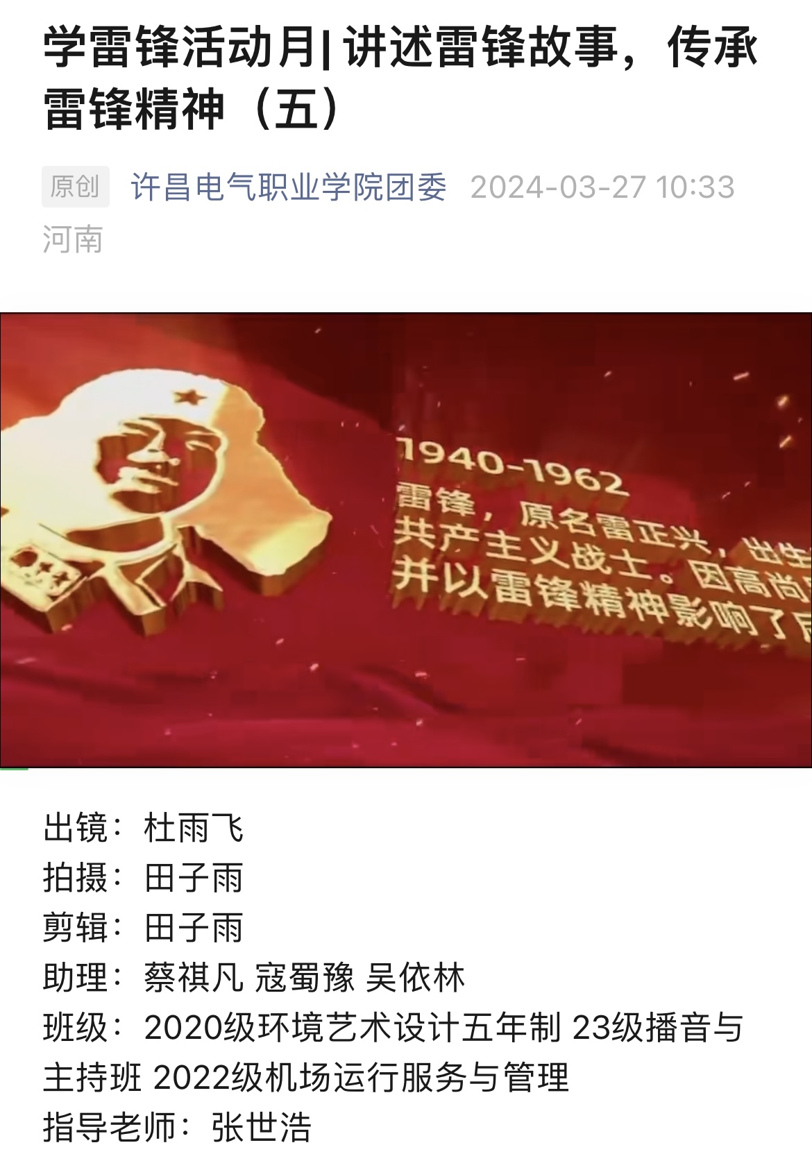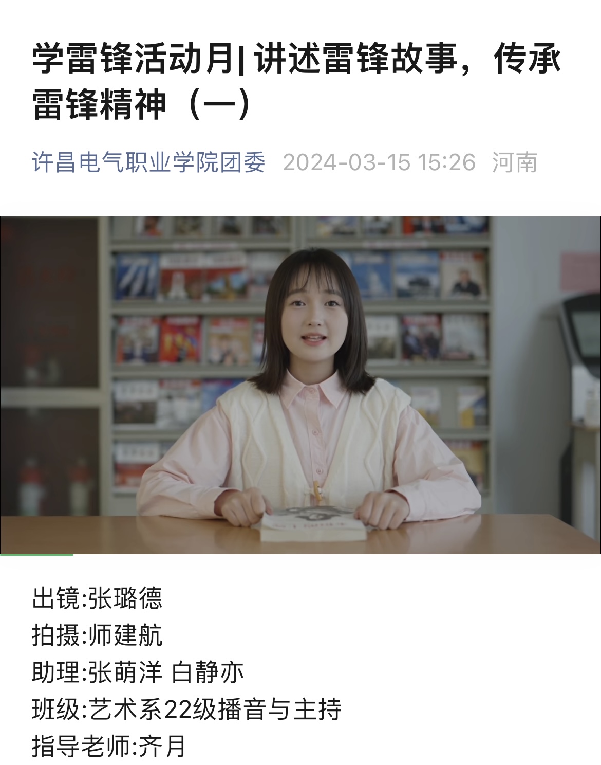 在学雷锋活动月中,各系推选出数名学生,以视频形式讲述雷锋故事,号召全体青年争做弘扬雷锋精神的倡导者、践行者和推动者。