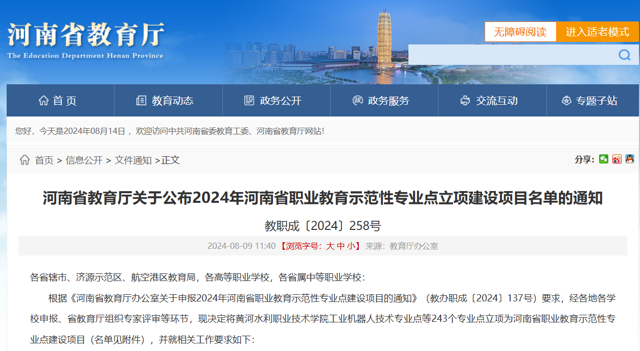 8月9日,河南省教育厅下发了关于公布2024年河南省职业教育示范性专业点立项建设项目名单的通知。许昌市共有两个省级示范性骨干专业成功申报,我院机电一体化技术专业是其中之一。