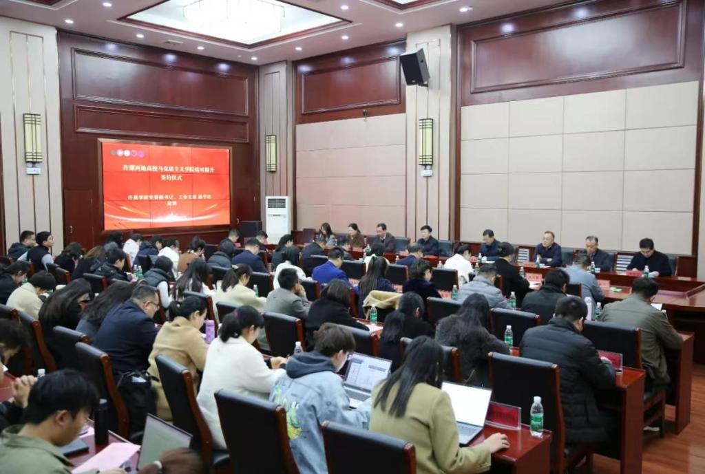 3月14日下午,由许昌学院马克思主义学院主办,中原科技学院马克思主义学院、许昌职业技术学院马克思主义学院、漯河医学高等专科学校马克思主义学院、许昌电气职业学院马克思主义学院协办的许漯两地高校马克思主义学院结对提升签约仪式暨学习贯彻习近平总书记“3·18”重要讲话精神研讨会在许昌学院顺利召开。许昌学院党委副书记、工会主席梁予昉,中原科技学院党委副书记、副校长杜建松,许昌职业技术学院党委书记来俊军,漯河医学高等专科学校党委副书记边晓峰,许昌电气职业学院党委副书记张明慧出席会议。我校马克思主义学院党总支负责人宋贵斌、行政负责人肖莹莹及10名思政课教师代表参会。会议分为两个阶段,分别由许昌学院党委宣传部部长王林和马克思主义学院院长周耀宏主持。