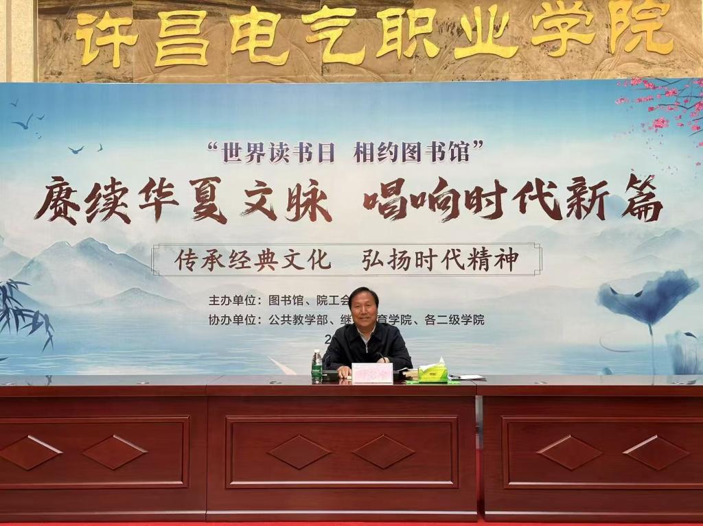 4月23日上午,许昌电气职业学院图书馆举办第十届读书节启动仪式。本届读书节以“赓续华夏文脉?唱响时代新篇”为主题,旨在弘扬中华优秀传统文化,推动校园阅读风尚,营造书香校园氛围。院工会主席张贵军、副院长贾楠出席仪式,院属相关单位负责人以及各系学生代表参加活动。