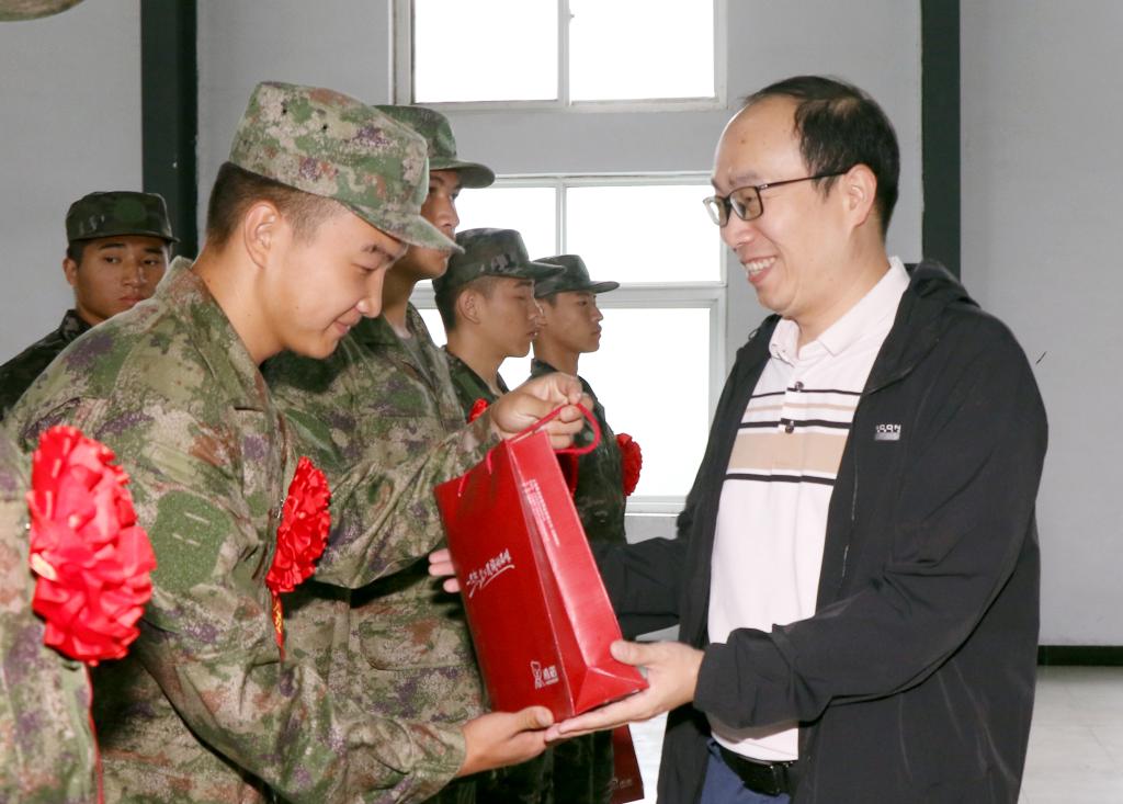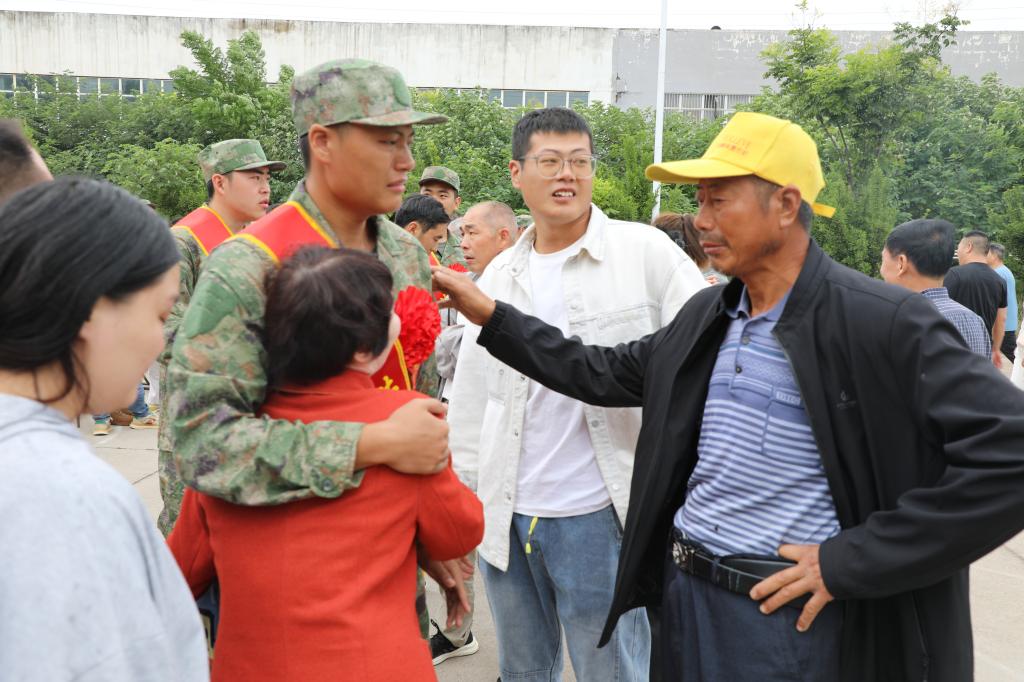 仪式结束后,欢送人员为入伍大学生佩戴大红花、发放纪念品并合影留念。