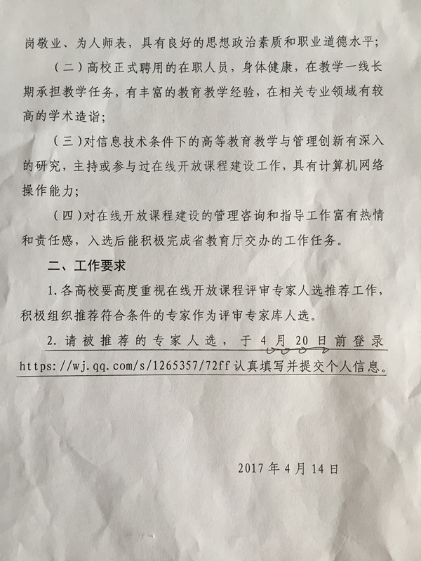 根据《河南省教育厅关于推荐河南省高校精品在线开放课程评审专家的通知》(教办高〔2017〕244号)(附件)文件精神,请通知本单位人员认真对照文件中评审专家人选的基本条件,符合条件的,请于4月20日上午12:00前到人事处报名,人事处汇总后由学院进行预审,通过的人员需于4月20日前登录https://wj.qq.com/s/1265357/72ff认真填写并提交个人信息。
