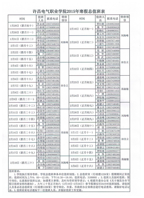 1.严格执行寒假值班要求和信息报告制度。学院执行领导带班、学院总值班和各单位值班制度。学院总值班由中层干部轮流值班,值班地点设在学院总值班室(行政楼1226室),值班时间为上午8:00—12:00,下午14:30—18:00,值班电话:3189900。保卫处坚持24小时值班,报警电话:18864650110。各单位值班安排情况须报送院长办公室,值班人员应到总值班室签到。各类值班人员做好值班记录。严格执行值班工作领导责任制度和责任追究制度,值班人员要认真履行职责,保证24小时通讯畅通。值班人员在值班期间如发现安全问题及影响学校稳定的情况,要及时报告带班领导或总值班室。