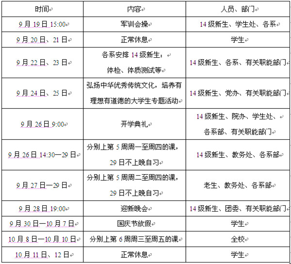 为确保国庆节前后各项工作有序进行,让广大师生能欢度国庆佳节,根据《国务院办公厅关于2014年部分节假日安排的通知》相关精神,结合我院实际,经学院研究,现将学院国庆节假日及近期工作安排如下: