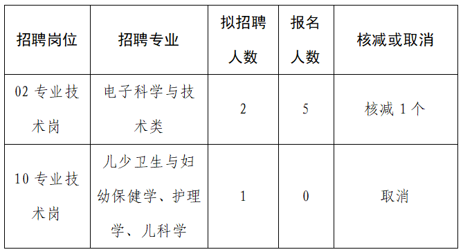 我院2022年公开招聘报名工作已经结束,根据《许昌电气职业学院2022年公开招聘工作人员公告》要求和各岗位报名情况,有2个报名人数不足的岗位须核减或取消。核减取消后,今年实际招聘人数为27名。