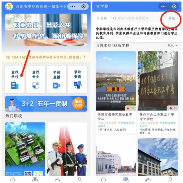 3、注册以后回到首页→选择“查找学校”→右上角“筛选”
