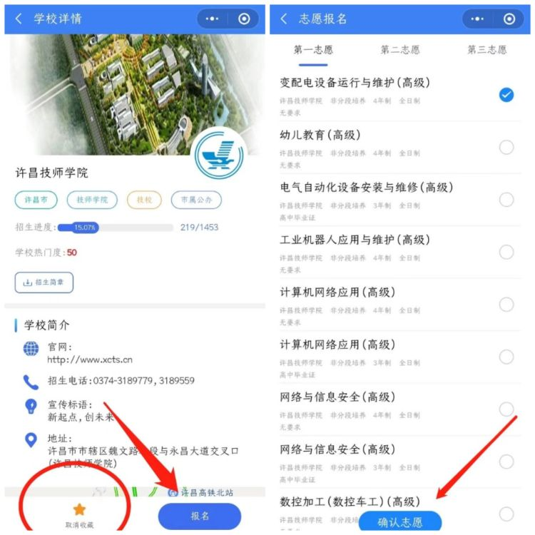 5、选择“许昌技师学院”,点击收藏不迷路,点击报名→选择专业→确认志愿