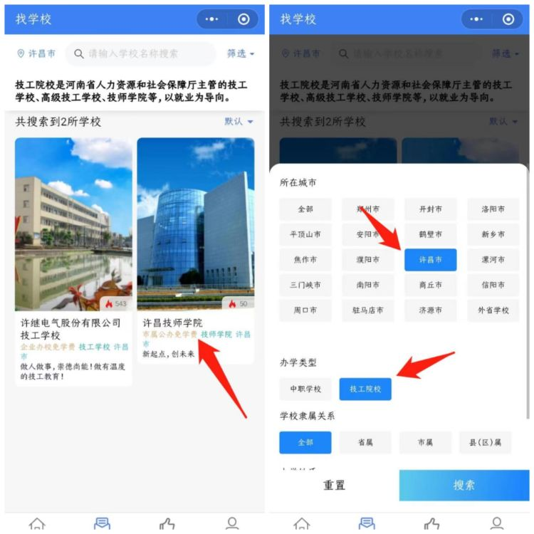 4、所在城市选择“许昌市”,办学类型选择 “技工院校”,筛选出“许昌技师学院”