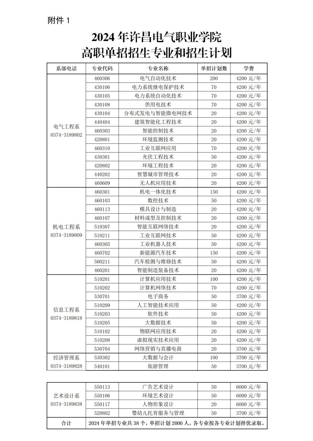 附件:1.2024年许昌电气职业学院高职单招招生专业和招生计划