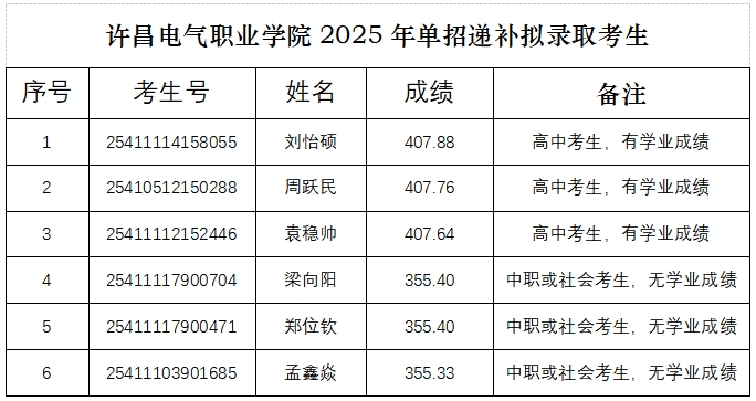 根据《许昌电气职业学院2025年单独招生工作实施方案》相关规定及工作流程,经考生本人申请、招生就业处审核,现对截至2025年4月27日18时自愿放弃录取资格的6名考生信息予以公示,名单如下: