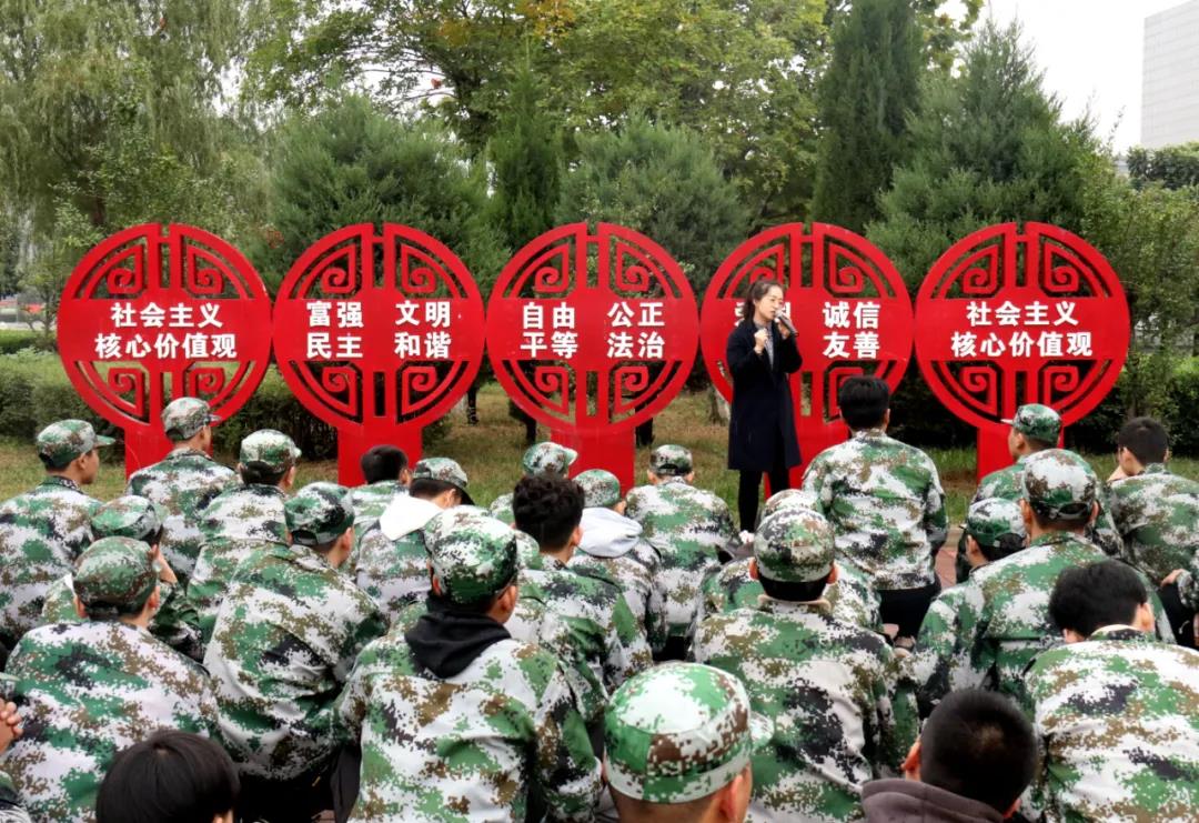 ????在对新生进行常规的军事训练和军事理论学习外,许昌电气职业学院还将思政课开到了“演兵场”上。10月15日,该校公共教学部的思政老师张自立利用新生军训休息间隙,给信息工程系2020级新生上了大学的第一堂思政课。