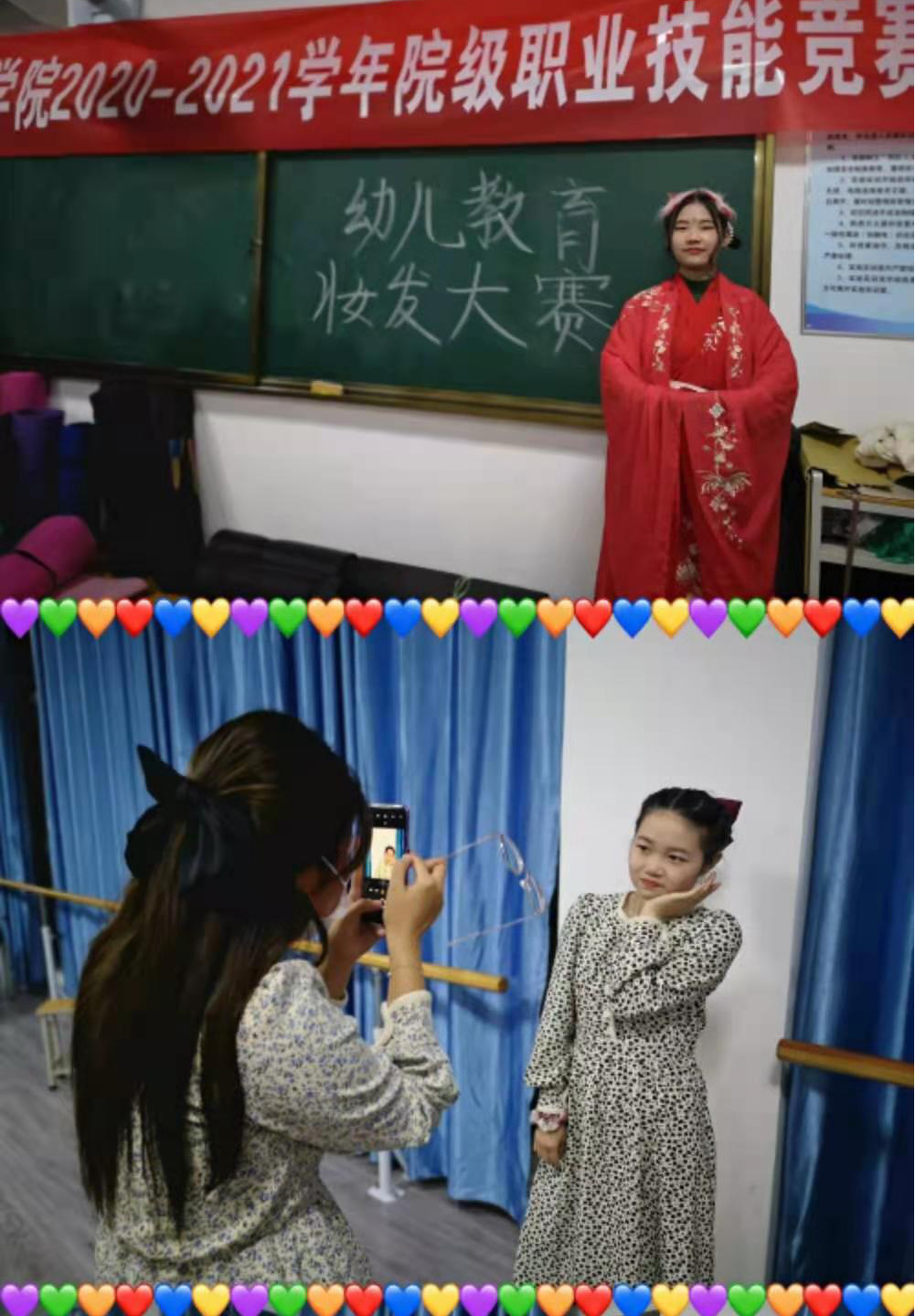 ????为提高学生的艺术修养和职业技能,展现学生的青春风采,丰富校园生活,艺术系19级幼儿教育班于12月10日下午在舞蹈教室举办了以‘“妆”饰自己 点亮未来'为主题的妆发比赛。