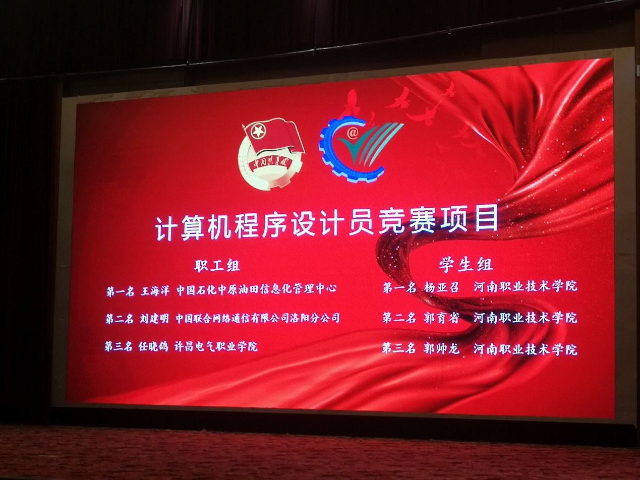 ????2019年9月26日至29日, 以“青春心向党 建功新时代”为主题的2019年中国技能大赛——第十五届“振兴杯”全国青年职业技能大赛河南省选拔赛暨“创出彩”2019年河南省青年职业技能大赛在漯河市成功举办。来自全省的参赛选手、大赛裁判长、裁判员等200余人参加大赛。我院信息工程系教师任晓鸽在计算机程序设计员赛项中获得河南省第三名,荣获“河南技术能手”称号,并代表河南省参加国赛决赛。