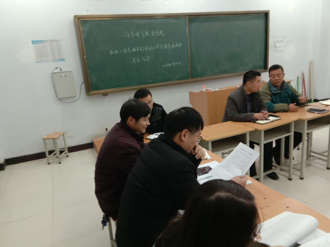 ????针对安全教育和检查过程中发现的问题,11月25日晚,根据“安全教育宣传月”活动内容,机电系专门召开辅导员(班主任)工作会议,强化全系辅导员(班主任)岗位责任心,要求务必全力做好安全教育工作。会后全系辅导员(班主任)积极签署《辅导员(班主任)安全教育承诺书》,并表示今后在班级管理中尽职尽责,做好我院学生安全教育和监督、防范工作。