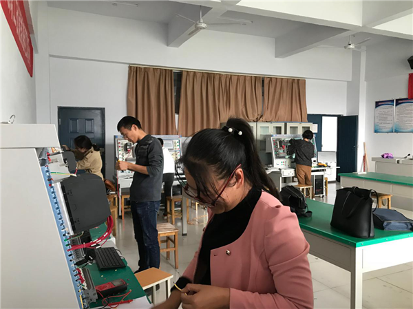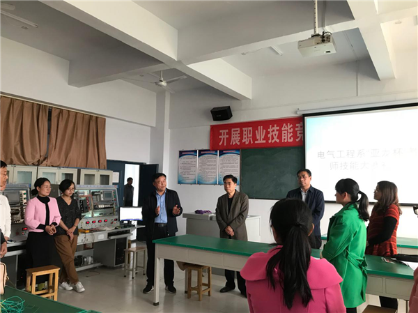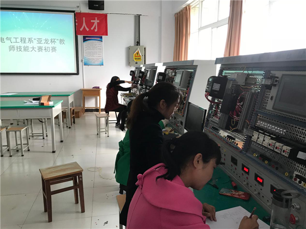 ????为迎接11月23日在我院举办的“2018 年全国职业院校机电类专业教师实践教学能力交流活动”,电气工程系于10月25日下午在实训楼A317举办了“亚龙杯”教师技能大赛初赛。院长杨德岭、副院长冯朝印在电气工程系负责人朱金伟的陪同下深入比赛现场看望技能大赛教师,了解备赛情况。