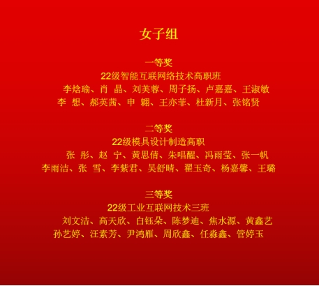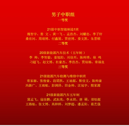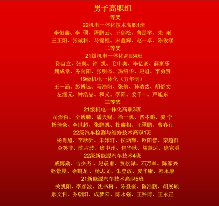 经过初赛、复赛、半决赛、总决赛的激烈角逐,此次拔河比赛共评出男子高职组一等奖1个、二等奖2个、三等奖3个,男子中职组一等奖1个、二等奖2个、三等奖2个,女生组一等奖1个、二等奖1个、三等奖1个,优秀奖11个,优秀辅导老师7名。系党总支书记刘建刚、系主任张红凯、系团总支书记杜羽、系学生科科长王会峰及系学生科程文浩老师为获奖队伍授予了锦旗并合影留念。