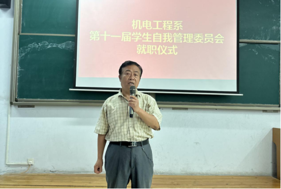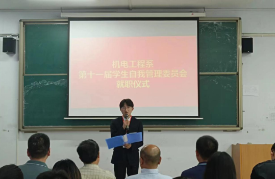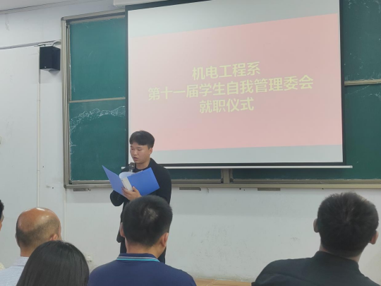 6月12日下午,机电工程系举行第十一届学生自我管理委员会干部任职仪式。系党总支书记刘建刚、系主任张红凯、党总支副书记冯振华、副主任王会峰、团总支书记程文浩、院学生处管理科卜伟松以及辅导员老师和外系代表出席。